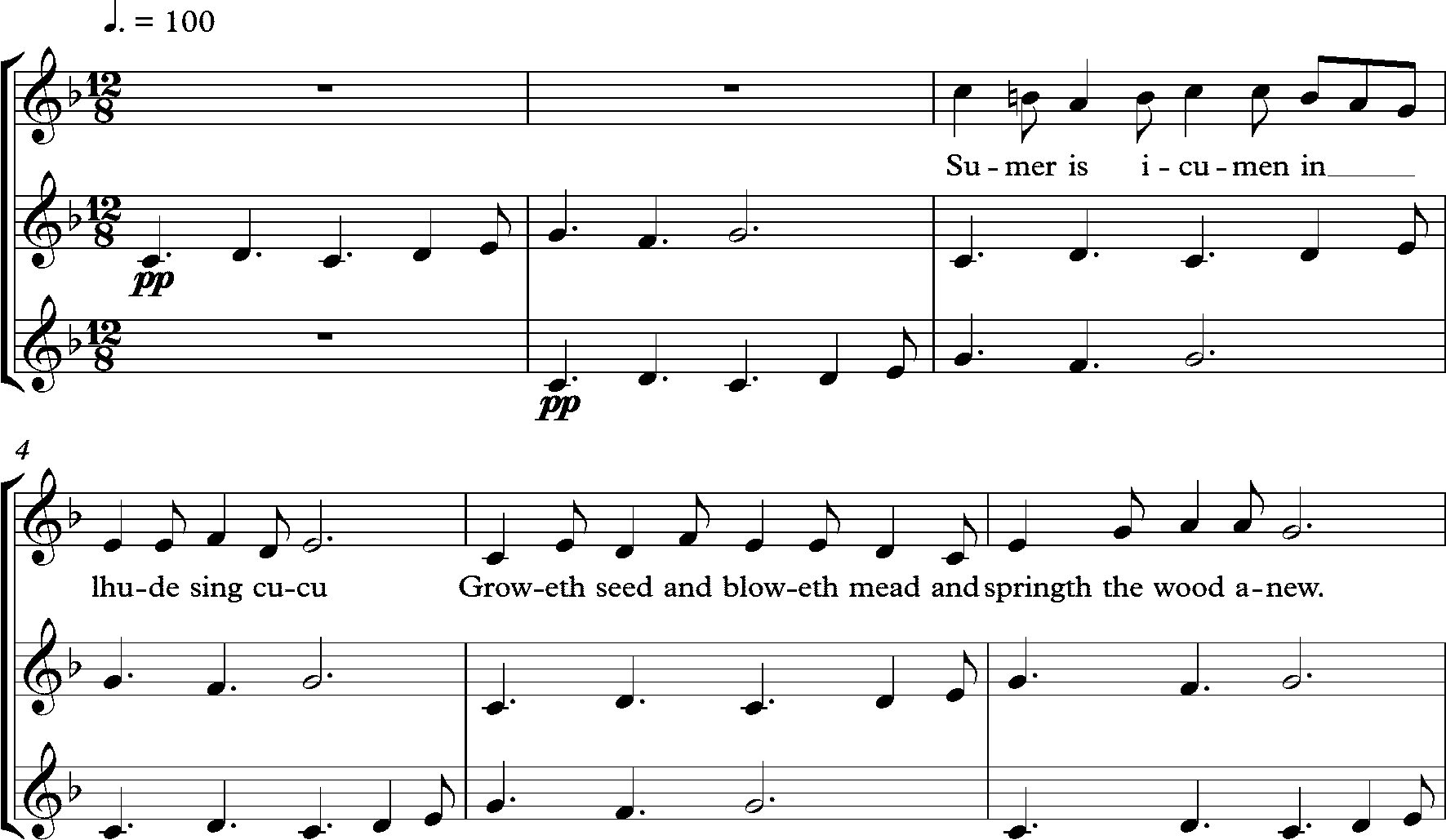 유명한 영국 캐논 "수머 이즈 이쿠멘 인"에서 주요 성부 선율은 "pes"로 알려진 오스티나토 패턴으로 뒷받침된다.[8]