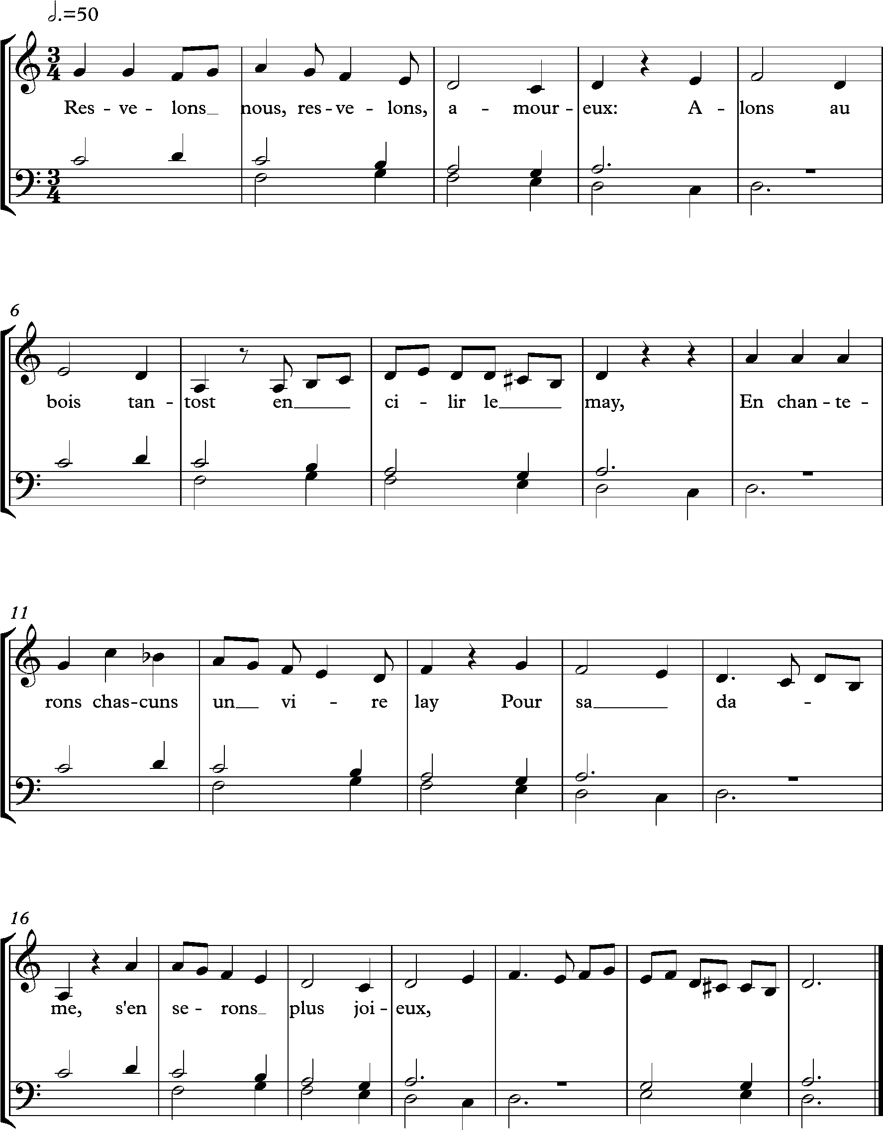 기욤 뒤파이의 샹송 "Resvelons Nous"는 5마디 길이의 오스티나토 패턴을 특징으로 하며, 그 위에서 주요 선율선은 자유롭게 움직인다.[8]