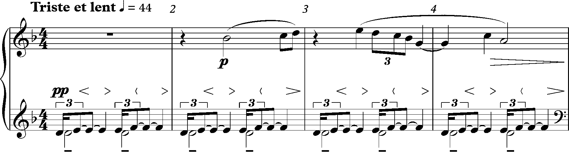 드뷔시는 피아노 전주곡 "[눈 위의 발자국]"(Des pas sur la neige) 전체에 걸쳐 오스티나토 패턴을 사용했다. 여기서 오스티나토 패턴은 피아노의 중간 음역에 머물며 베이스로 사용되지 않는다.