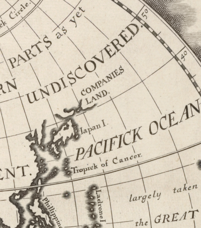 유럽인 중 최초로 이 지역에 도달한 기록은 1643년 네덜란드 동인도 회사(VOC) 소속의 탐험선 Castricumnl 호이다. 마르턴 헤리츠츠 브리스가 이끄는 이 배는 홋카이도와 주변 지역을 탐험하던 중 쿠릴 열도에 도착했다.[4] 당시에는 경도를 정확히 측정하기 어려웠기 때문에, 브리스가 섬들의 위치를 잘못 기록한 것이 이후 유럽 지도에 'Companies Landtnl'(Terre de la Compagnie프랑스어)라는 거대한 유령 섬이 등장하는 계기가 되었다.[4] 네덜란드 동인도 회사의 이름을 딴 이 유령 섬은 브리스가 북아메리카 대륙의 북서쪽 끝부분이라고 생각했던 곳으로, 저명한 지도 제작가였던 얀 얀소니우스, 니콜라 상송, 기욤 드릴 등의 지도에 실리면서 약 1세기 동안 유럽 지도에 계속 나타났다. 이후 더 정확한 측량이 이루어지면서 사라지게 되었다. 브리스가 상륙했던 지점은 우루프섬으로 추정되기도 한다.[3][5]