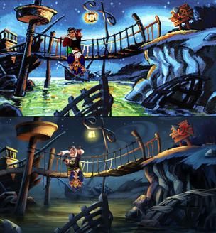 그 결과, 그들의 개념 중 다수가 최종 게임에 구현되었으며, 게임 배경의 섬들 사이를 이동하는 동안 플레이어 캐릭터를 묘사하는 "나사 빠진" 비플레이 시퀀스에 대한 아이디어는 인디아나 존스 영화의 유사한 장면을 패러디한 것으로, 화면상의 오버월드 맵에 표시되었다.[23] 또한, 이스터 에그가 있는 도서관 위치에 대한 개념이었다.[23]