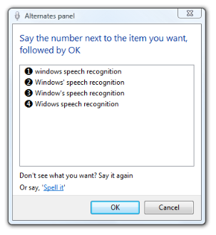 - 대체 패널: 사용자가 말한 단어나 구문과 관련하여 여러 항목이 있을 경우, 관련된 항목들을 나열하는 인터페이스이다. 사용자는 원하는 항목의 번호를 말하고 "OK"라고 말하여 선택, 삽입할 수 있다.[50] 예를 들어, "Internet Explorer 시작"이라고 말하면 웹 브라우저와 추가 기능이 비활성화된 별도의 버전이 모두 나열될 수 있다.[51]
