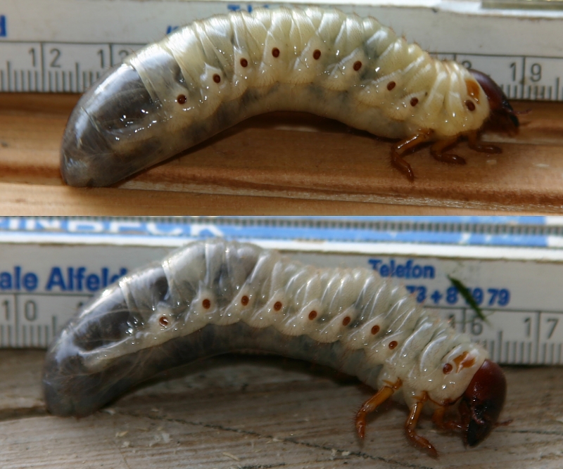 애벌레는 썩은 나무 그루터기나 톱밥 주위에서 발견된다. 썩은 식물이나 나무 부스러기(목재 섭취)를 먹고 살며, 주로 수지가 없는 나무를 선호한다. 애벌레의 길이는 60mm에서 최대 100mm까지 자랄 수 있으며, 발육 기간은 2년에서 4년 정도 걸린다. 애벌레 시기에 섭취하는 먹이의 질과 양이 성충의 크기에 영향을 미친다.