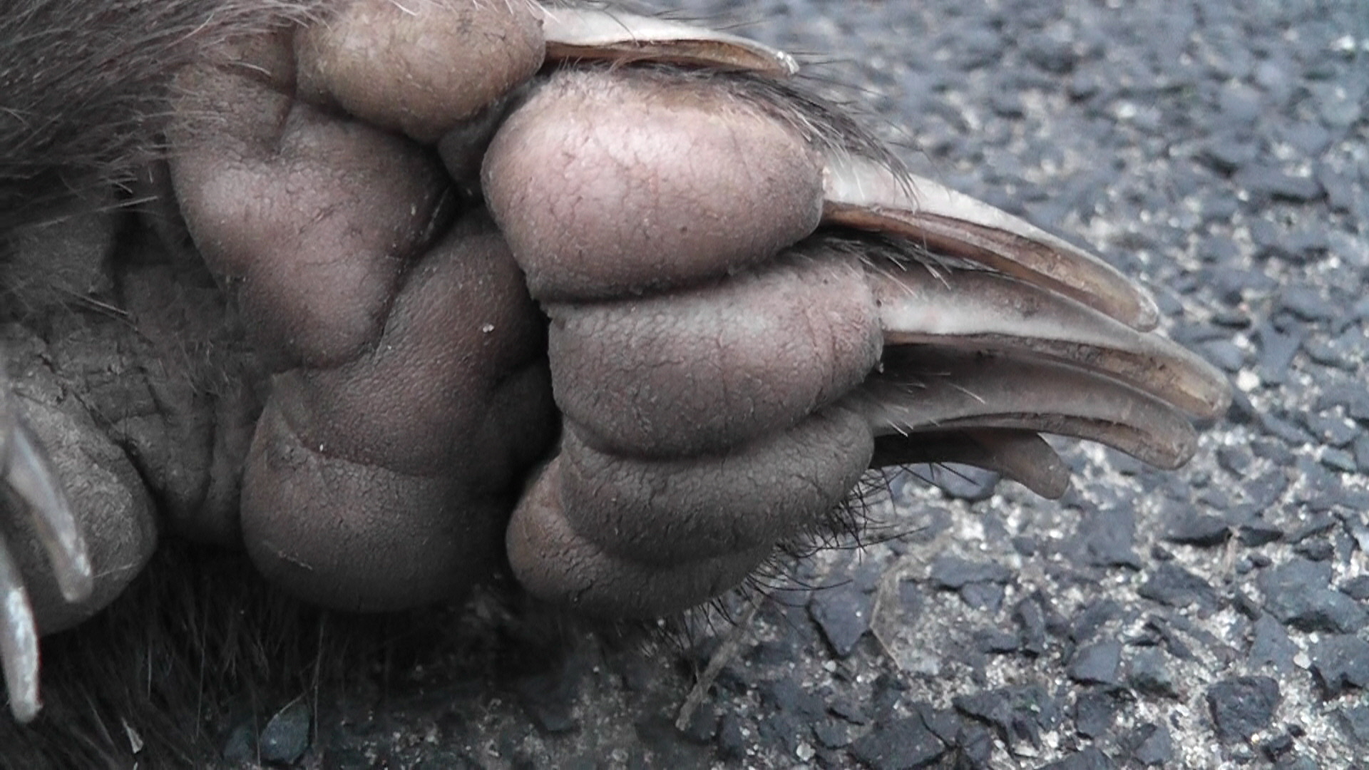 겨울에는 등과 옆구리의 털이 길고 억세며, 뻣뻣한 보호털과 듬성듬성 부드러운 속털로 구성된다. 배의 털은 짧고 듬성듬성하며, 사타구니 부위에서 피부가 보인다. 겨울철 등 중앙부의 보호털 길이는 75mm 에서 80mm이다. 겨울 전에는 목, 목 아랫부분, 가슴 및 다리가 검은색이다. 배는 더 밝고 갈색을 띠며, 사타구니 부위는 갈색-회색이다. 등과 옆면의 전반적인 색상은 밝은 은색-회색이며, 옆면에는 짚색 하이라이트가 있다. 꼬리에는 길고 억센 털이 있으며, 일반적으로 등과 같은 색상이다. 두 개의 검은색 띠가 머리를 따라 지나가는데, 윗입술에서 시작하여 귀 전체 기저부까지 위로 이어진다. 띠는 때때로 목을 따라 뻗어 상체 색상과 합쳐진다. 띠의 앞부분 폭은 15mm이고, 귀 부위에서는 45mm 에서 55mm로 넓어진다. 넓고 흰색 띠가 코끝에서 이마와 정수리를 지나 뻗어 있다. 머리 아랫부분에는 흰색 무늬가 있으며, 목 길이의 상당 부분까지 뒤로 뻗어 있다.