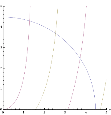 인 경우, 파란색 반원이 보라색 또는 회색 곡선( 및 )과 교차하는 곳에 해가 존재한다. 각 보라색 또는 회색 곡선은 가능한 해 를 나타내며, 범위는 이다. 따라서 전체 해의 수 (파란색 원과 교차하는 보라색/회색 곡선의 수)는 파란색 원의 반경 를 각 해의 범위 로 나누고 바닥 또는 천장 함수를 사용하여 결정된다.[6]