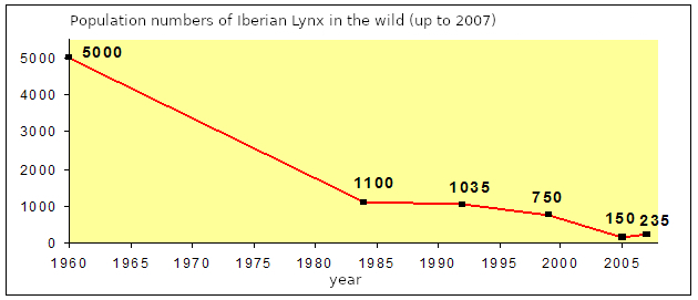 이베리아스라소니는 인간 활동으로 인해 생존에 큰 위협을 받아왔다. 알칸타라 호수의 댐 건설, 농지 개발, 상업적 목적의 유칼립투스나 소나무 조림 등으로 인해 서식지가 파괴되고 단편화되었다.[93] 또한, 주요 먹이인 유럽 토끼가 서식지 변화와 점액종증, 토끼 출혈병과 같은 감염병 확산으로 인해 급감하면서 스라소니의 생존을 더욱 어렵게 만들었다.[93][91] 고양이로부터 고양이 백혈병 바이러스(FeLV)와 같은 질병이 전파될 위험도 우려되고 있다.[91] 과거 이베리아 반도 전역에 분포했으나,[93] 이러한 요인들로 인해 개체수가 급격히 감소하여 심각한 멸종 위기에 처했었다.