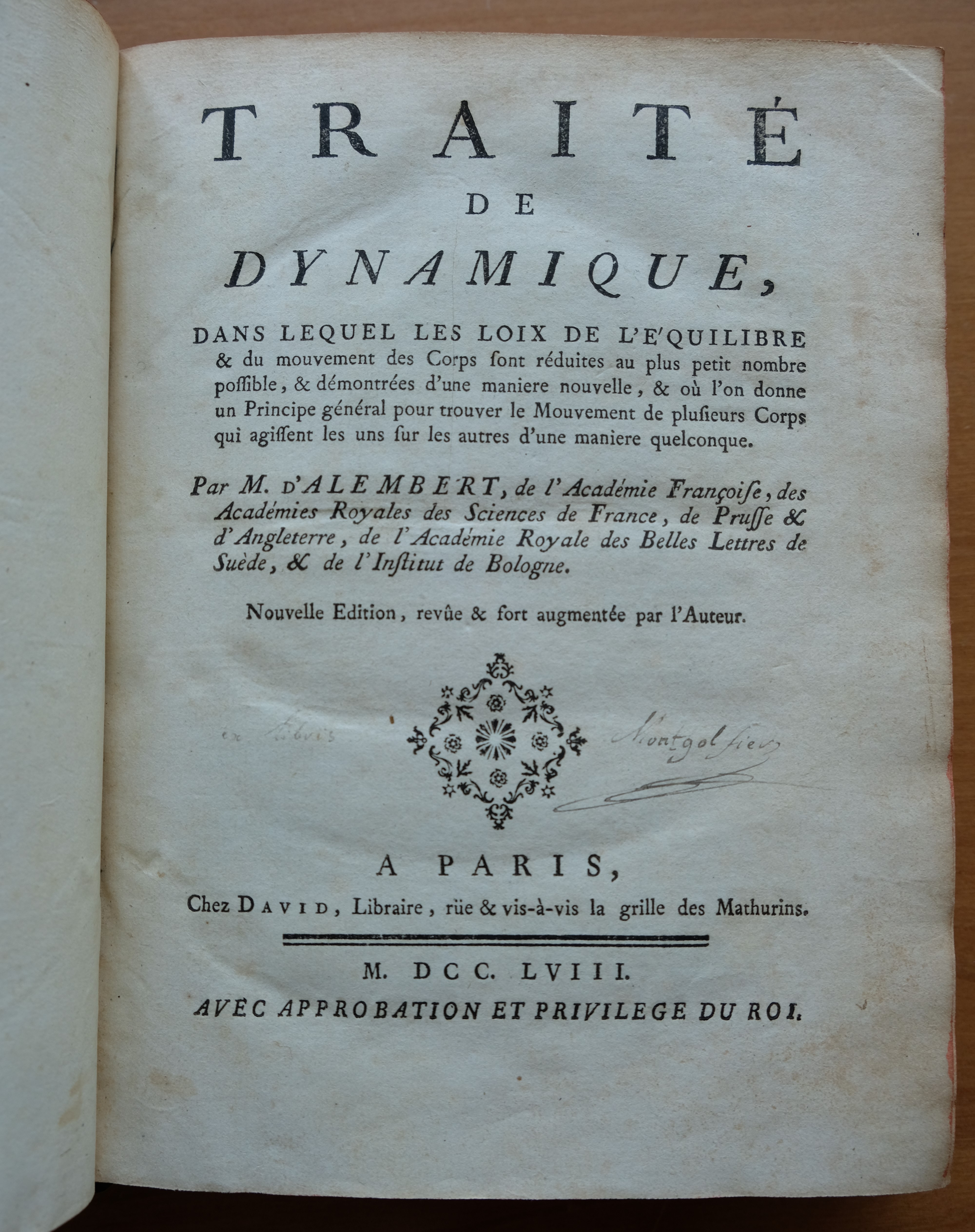 1743년, 달랑베르는 자신의 운동 법칙을 개발한 ''Traité de dynamique''(역학편)을 출판했다.[12] 그는 이 책에서 역학을 단순한 실험 과학이 아니라 혼합 응용 수학의 제1 부문이라고 주장했다. 뉴턴의 역학을 긍정하면서도, 그 안에 나타난 신의 영향을 제거했다는 점에서 큰 업적을 남겼다. 또한 "역학" 항목에서 달랑베르의 원리를 제시했다.