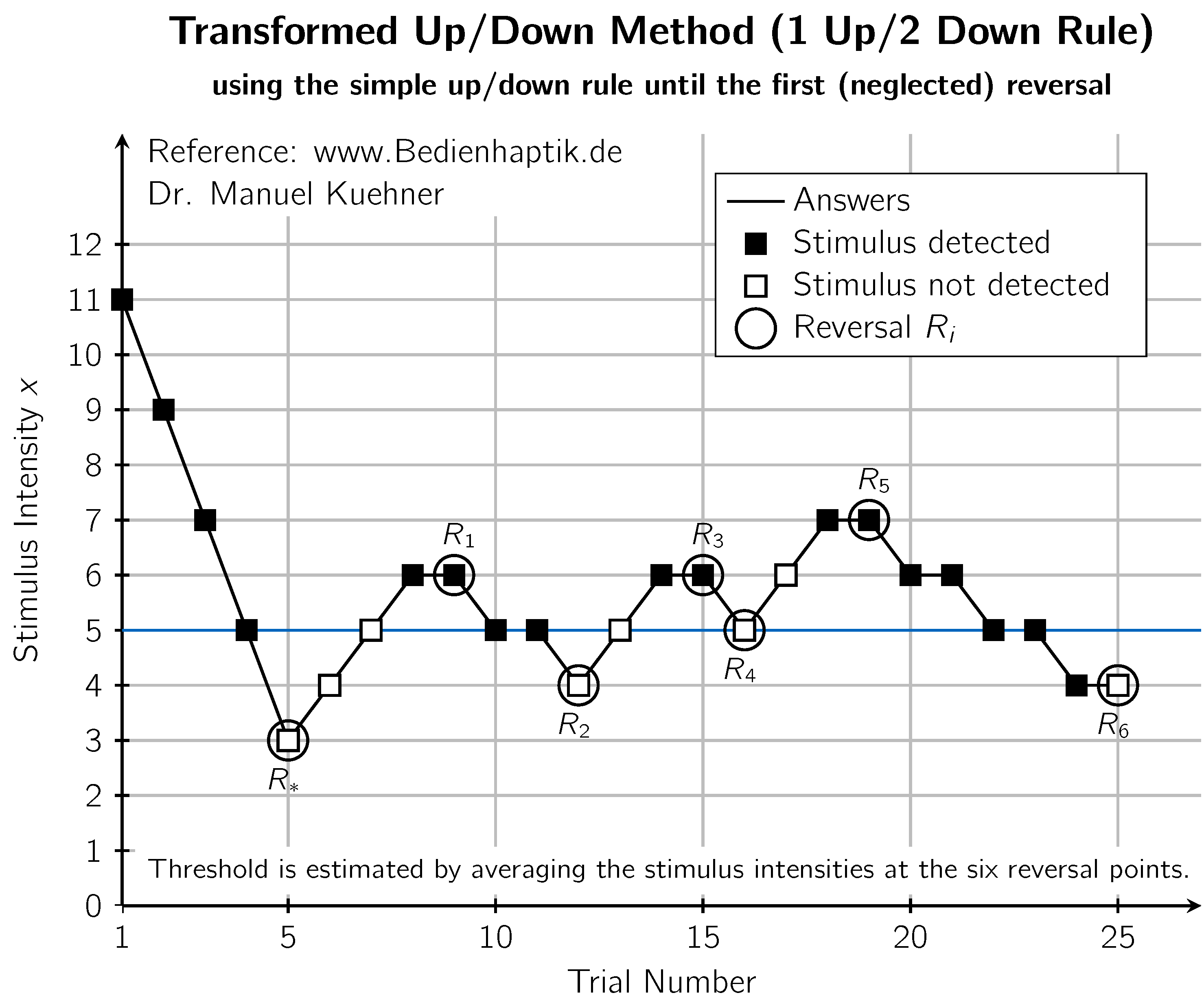 계단식 절차는 일반적으로 감지하기 쉬운 높은 강도의 자극으로 시작한다. 그런 다음 관찰자가 실수를 할 때까지 강도가 감소하고, 그러면 계단이 '반전'되고 관찰자가 올바르게 응답할 때까지 강도가 증가하여 또 다른 반전을 유발한다. 이러한 '반전'의 마지막 값은 평균화된다. 서로 다른 결정 및 종료 규칙을 사용하여 다양한 유형의 계단식 절차가 있다. 단계 크기, 상/하 규칙 및 기본 심리측정 함수의 확산은 심리측정 함수의 어느 지점에서 수렴하는지를 결정한다.[24] 계단식 절차에서 얻은 역치 값은 크게 변동될 수 있으므로 설계에 주의를 기울여야 한다. Garcia-Perez는 많은 다른 계단식 알고리즘을 모델링했으며 몇 가지 실용적인 권장 사항을 제시했다.[25]