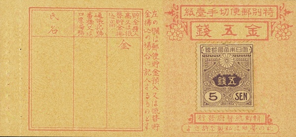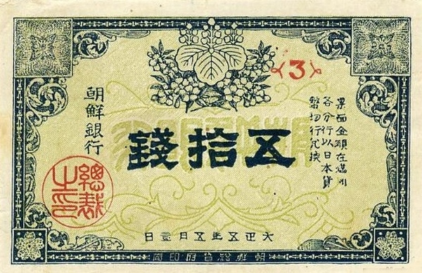 1902년부터 1910년까지는 제일은행에서 지폐를 발행했다. 액면가는 10센, 20센, 50센, 1엔, 5엔, 10엔이었다. 센 지폐는 세로형이었으며, 1872년의 일본 센 지폐와 세기말의 일본 군용 엔화와 비슷했다. 이 지폐는 "한국 내 모든 지점에서 일본 화폐로 교환 가능했다".[1]