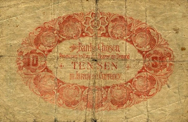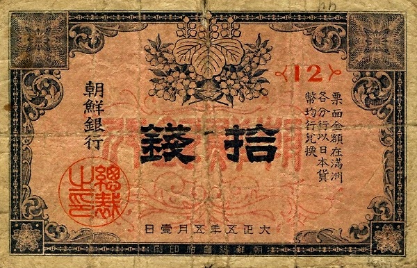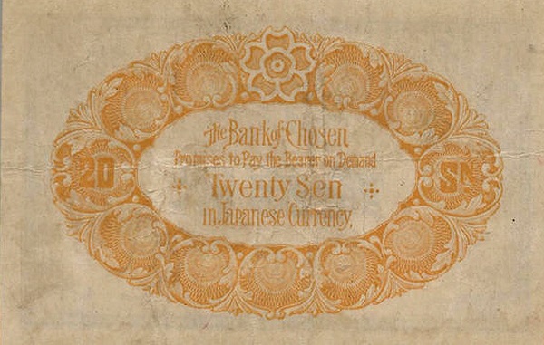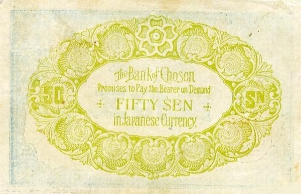 한국은행 지폐는 1909년에 발행일자가 표기되었고 1910년과 1911년에 발행되었다. 1910년 한국이 일본에 주권을 잃은 후, 한국은행은 조선은행(Bank of Chōsen)(朝鮮銀行, 한국어: 조선은행, 일본어: Chōsen Ginkō)으로 이름이 바뀌었다. 첫 번째 조선은행 지폐는 1911년에 발행일자가 표기되었고 1914년에 발행되었다. 1엔, 5엔, 10엔, 100엔이 정기적으로 발행되었고, 때때로 센 지폐(5센, 10센, 20센, 50센)도 발행되었다. 1000엔권도 인쇄되었지만 제2차 세계 대전 말에는 발행되지 않았다. 초기 발행분은 "금 또는 일본은행(Nippon Ginko) 지폐"로 교환 가능했다. 유사한 문구가 후기 발행분에는 일본어로 기재되었다. 화폐에 있는 노인의 이미지는 아마도 김윤식을 기반으로 한 장수의 상징적인 표현일 것이다.[2]