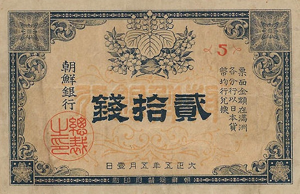 한국은행 지폐는 1909년에 발행일자가 표기되었고 1910년과 1911년에 발행되었다. 1910년 한국이 일본에 주권을 잃은 후, 한국은행은 조선은행(朝鮮銀行)으로 이름이 바뀌었다. 첫 번째 조선은행 지폐는 1911년에 발행일자가 표기되었고 1914년에 발행되었다. 1엔, 5엔, 10엔, 100엔이 정기적으로 발행되었고, 때때로 센 지폐(5센, 10센, 20센, 50센)도 발행되었다. 1000엔권도 인쇄되었지만 제2차 세계 대전 말에는 발행되지 않았다. 초기 발행분은 "금 또는 일본은행 지폐"로 교환 가능했다. 유사한 문구가 후기 발행분에는 일본어로 기재되었다. 화폐에 있는 노인의 이미지는 아마도 김윤식을 기반으로 한 장수의 상징적인 표현일 것이다.[2]