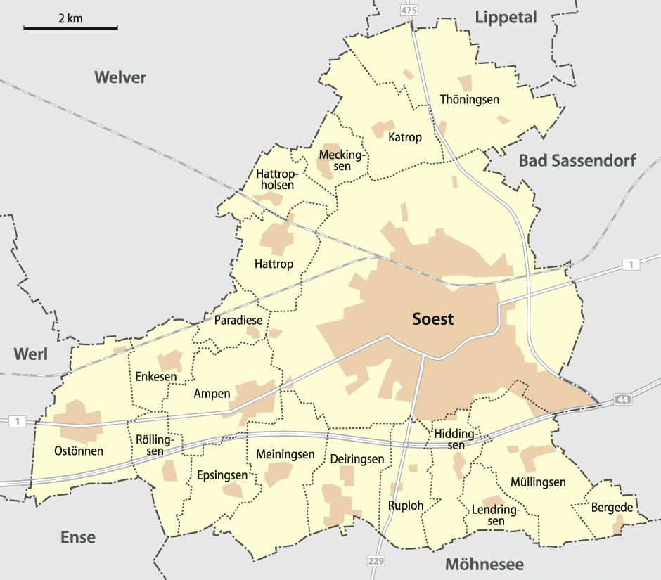 헬베크 도로를 따라 위치해 있으며, 립슈타트에서 남서쪽으로 약 23km, 도르트문트에서 동쪽으로 약 50km, 파더보른에서 서쪽으로 약 50km 떨어져 있다.3. 2. 주변 지역