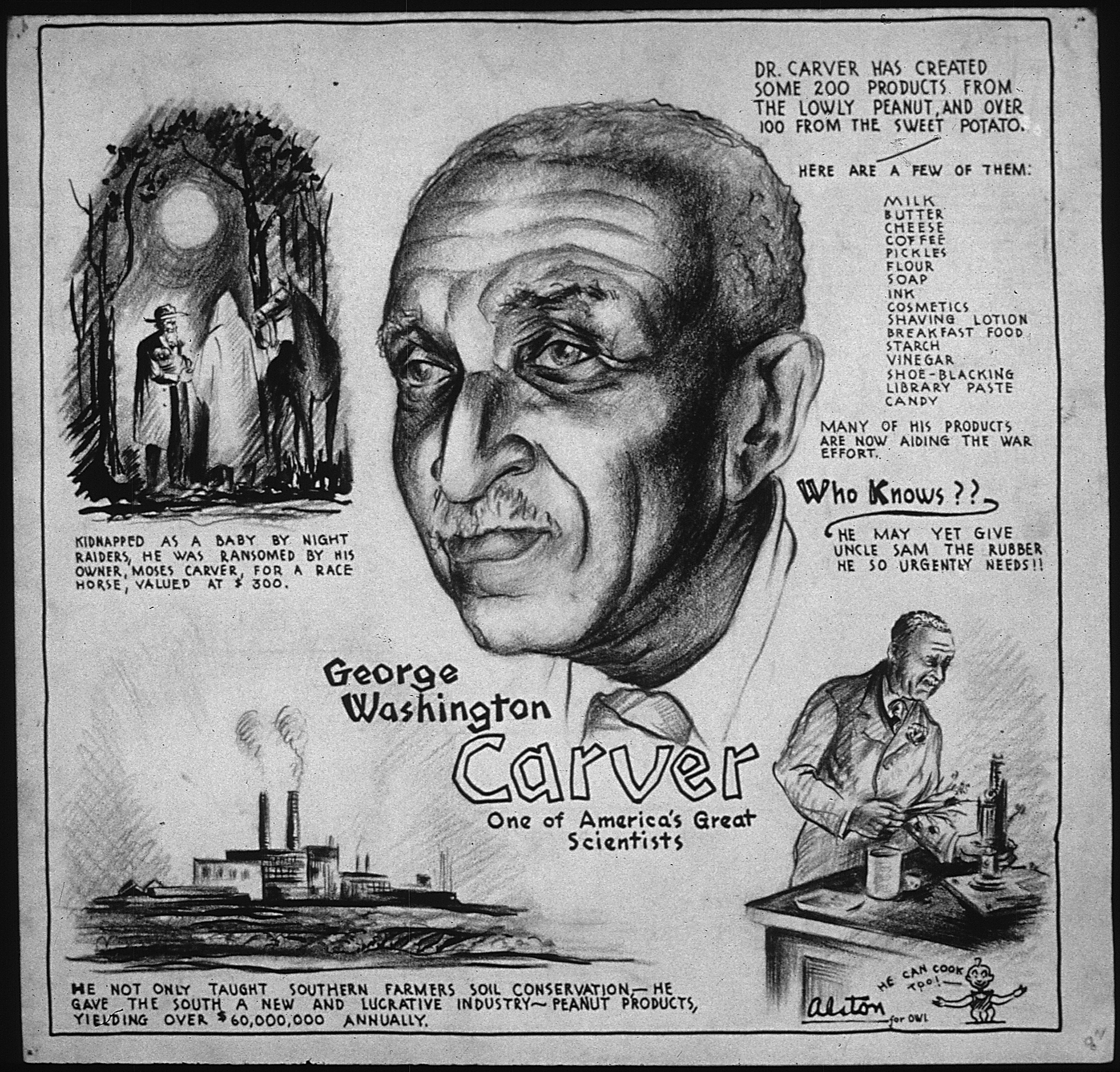 "미국의 위대한 과학자 중 한 명" – C. H. 앨스턴이 제작한 여러 카버 중심 포스터 중 하나로, 제2차 세계 대전 당시를 언급하고 있다(1943년경)