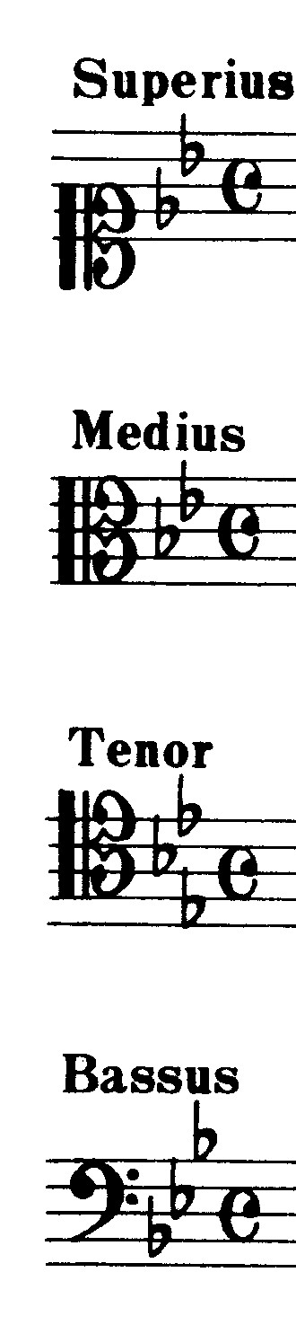 빅토리아의 모테트에서 나타나는 다양한 조표. ''수페리우스''(소프라노) 파트에서는 E이 먼저 나타나고, 다른 두 파트에서는 플랫이 두 옥타브에 걸쳐 나타난다.