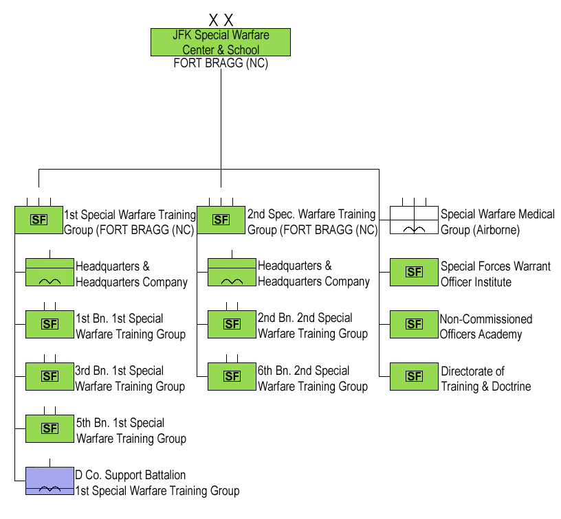 1990년 6월 20일, 전방배치된 부대를 뺀 모든 특수작전부대를 미국 육군 특수작전사령부(USASOC) 통제에 두도록 하는 방침에 따라 기관은 TRADOC에서 USASOC로 전속하였다.[5]
