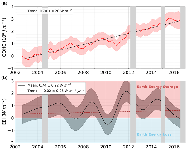 지구 에너지 변화의 주요 원인은 인간이 유발한 대기 구성 변화이며, 이는 약 460 TW 또는 전 세계적으로 에 달한다.[26]
