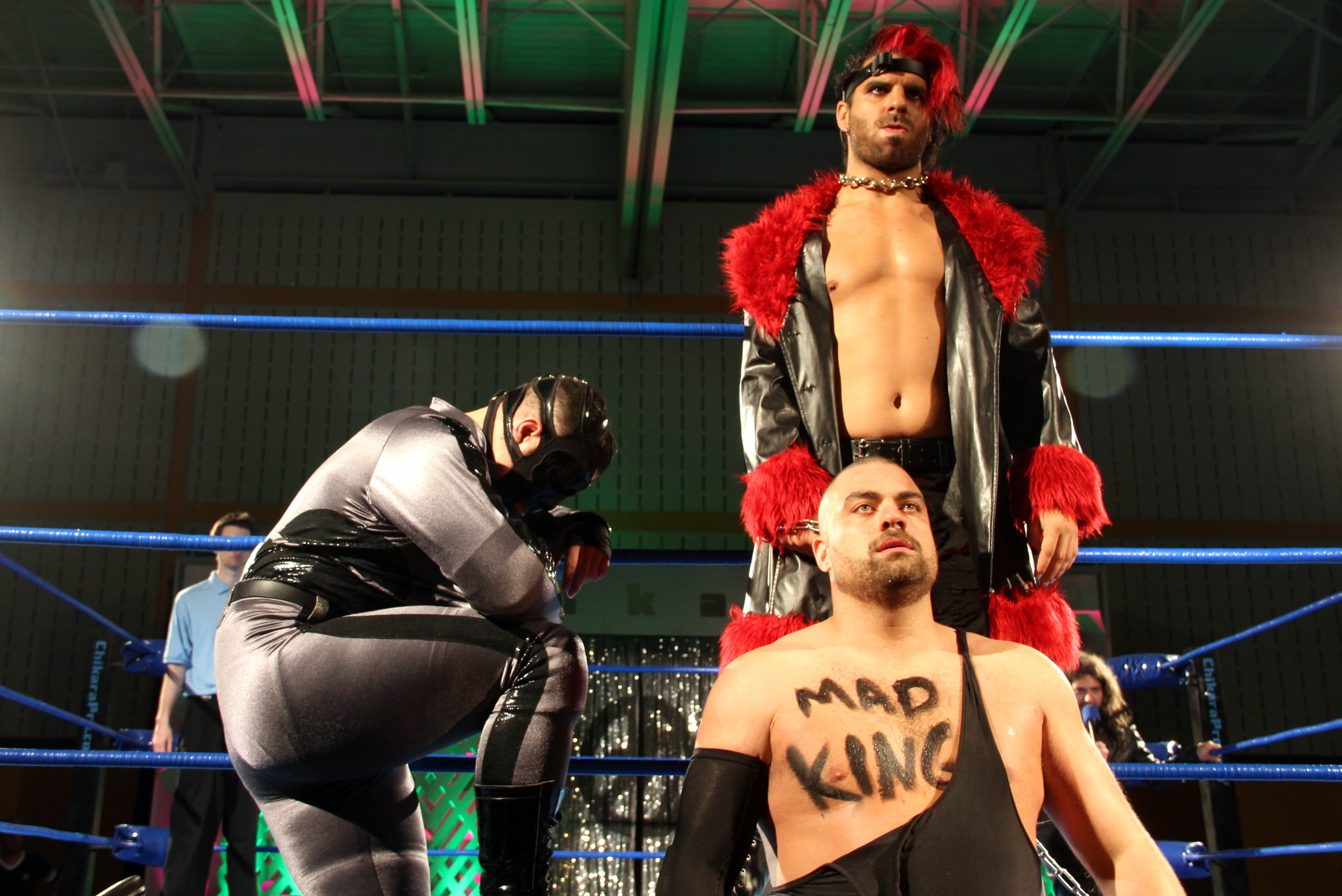 프로 레슬링 게릴라 행사에서 제이콥스(오른쪽)와 타일러 블랙 함께 링에 있다.