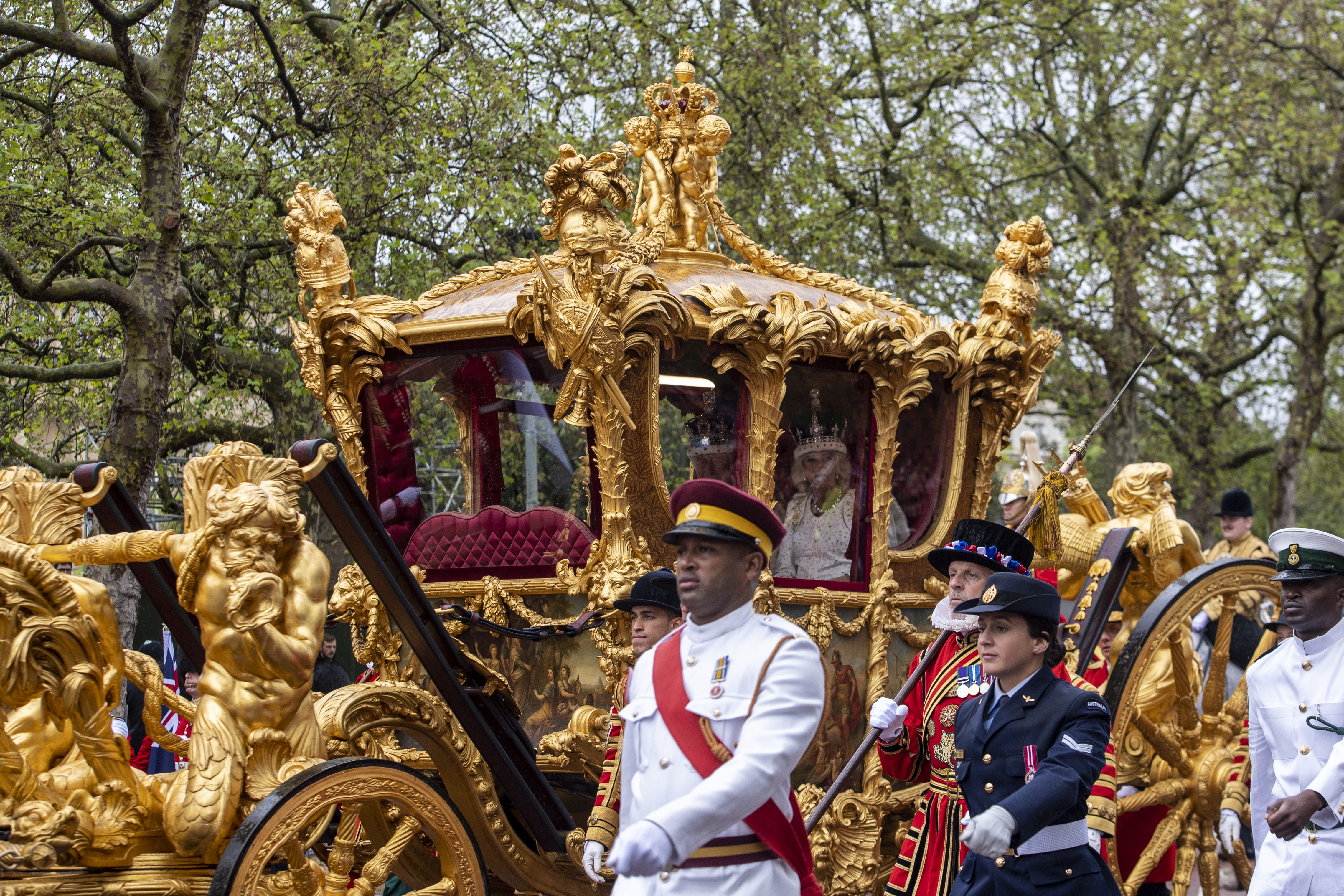 찰스 3세와 카밀라는 다이아몬드 주빌리 궁정 마차를 타고 웨스트민스터 사원으로 이동했다.[97] 버킹엄 궁에서 영국 서머타임(BST) 기준 오전 10시 20분에 출발하여 더 몰, 화이트홀, 팔러먼트 스트리트를 지나 국회 광장의 동쪽과 남쪽을 돌아 웨스트민스터 사원의 서쪽 대문에 도착했다. 이동 거리는 약 약 2.29km였다.[97] 찰스 3세와 카밀라는 윈저 그레이 6마리가 끄는 다이아몬드 주빌리 궁정 마차를 이용했으며, 왕실 기병대 기갑 연대의 군주 호위대가 함께했다.[97][100] 2018년부터 제작 중이던 새로운 마차가 국왕을 위한 것이었지만, 제때 완성되지 못해 다이아몬드 주빌리 마차가 대신 사용되었다.[101]