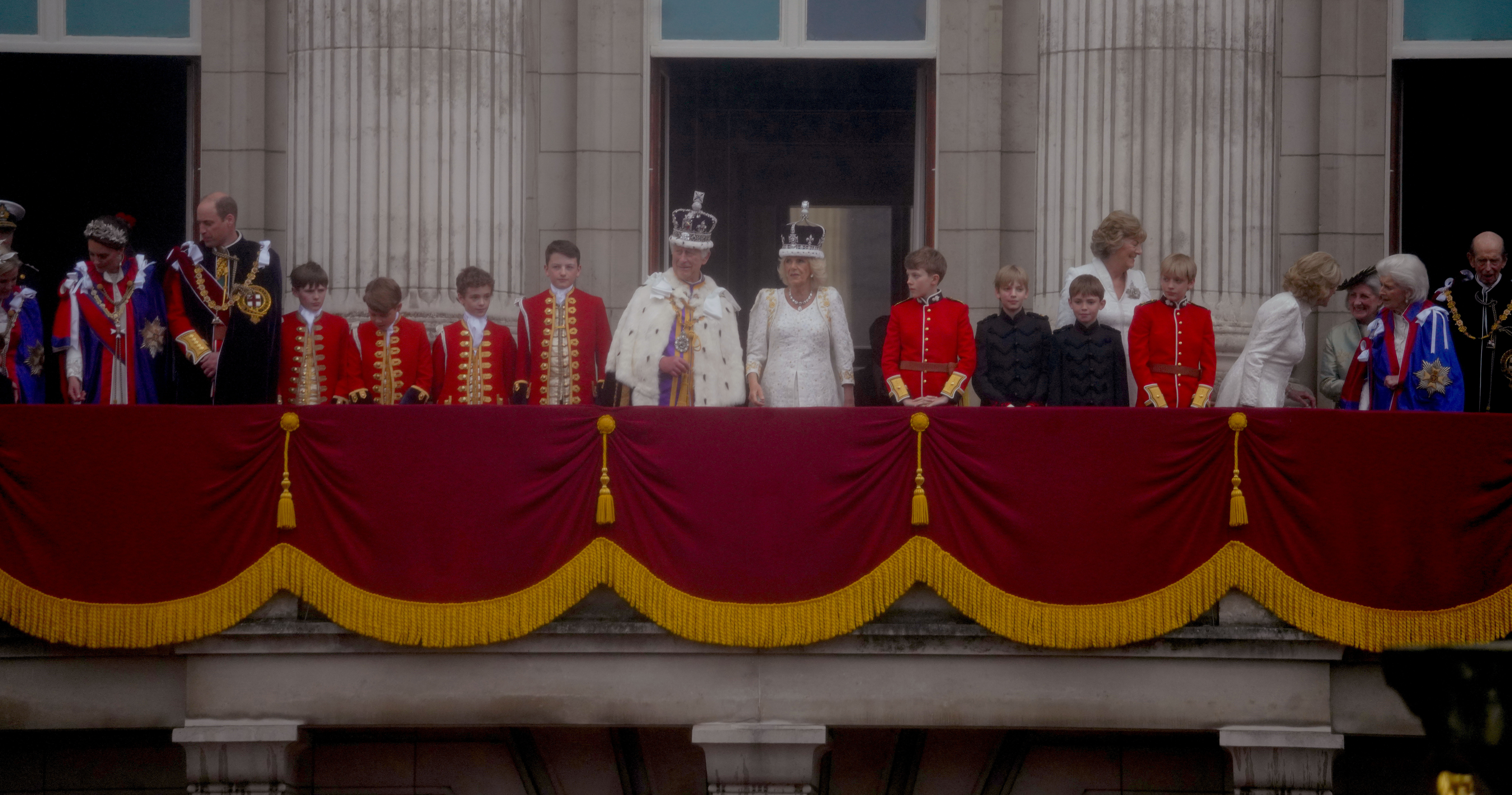 대관식 후 [[버킹엄궁]] 발코니에서 손을 흔드는 국왕과 왕비