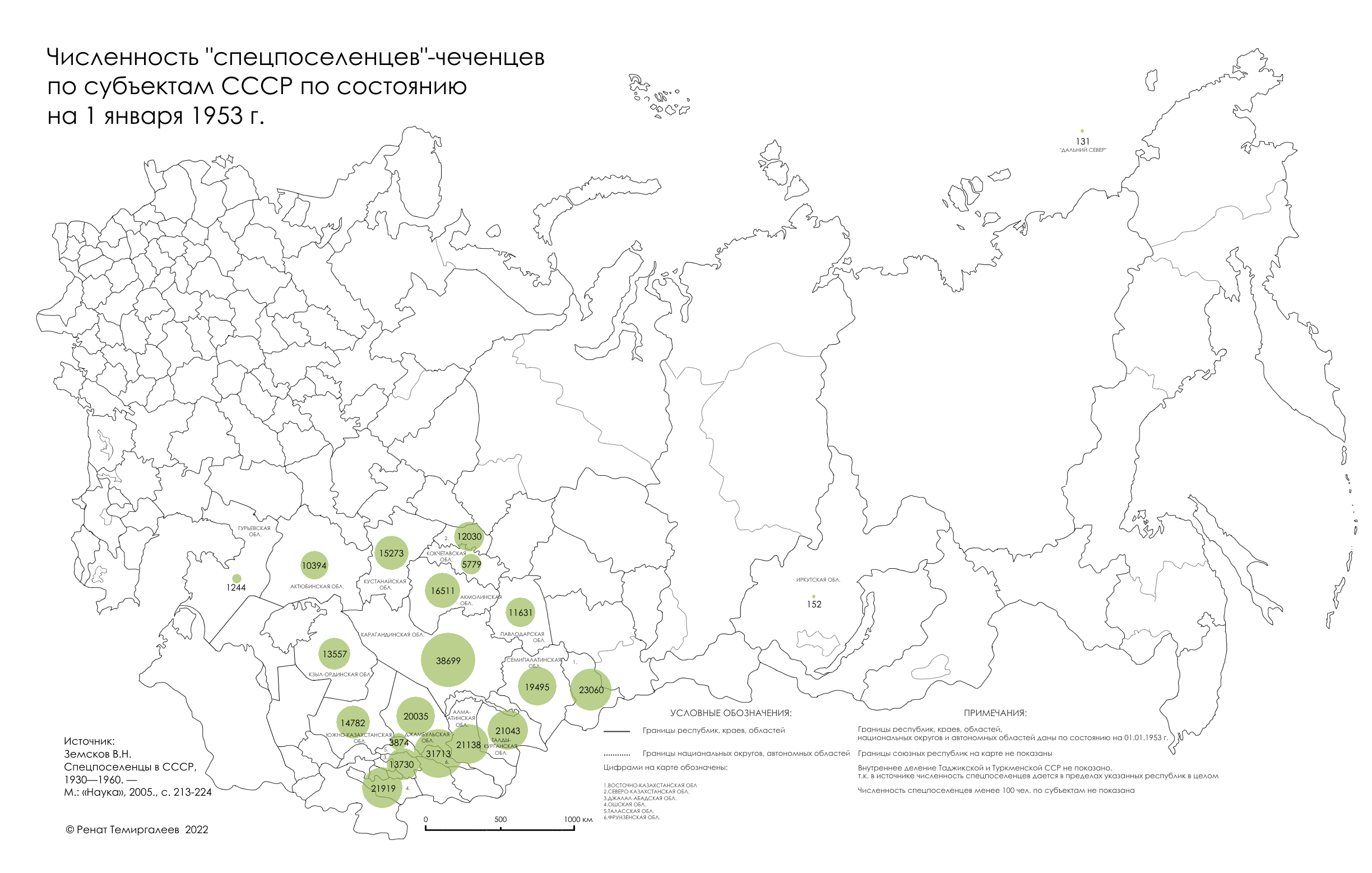 1948년 소련 최고 소비에트 간부회는 추방된 민족들에게 영구 추방을 선고했고,[7] 정착민들은 새로운 거주지에서 3km 이상 이동하는 것이 금지되었으며,[8] 추방 관련 언급은 금지되었다.[9]