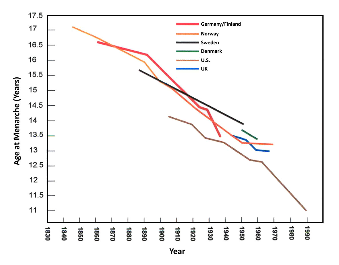 이러한 초경 연령의 하락 추세를 세속적 경향(secular trend)이라고 부른다.[38][39]
