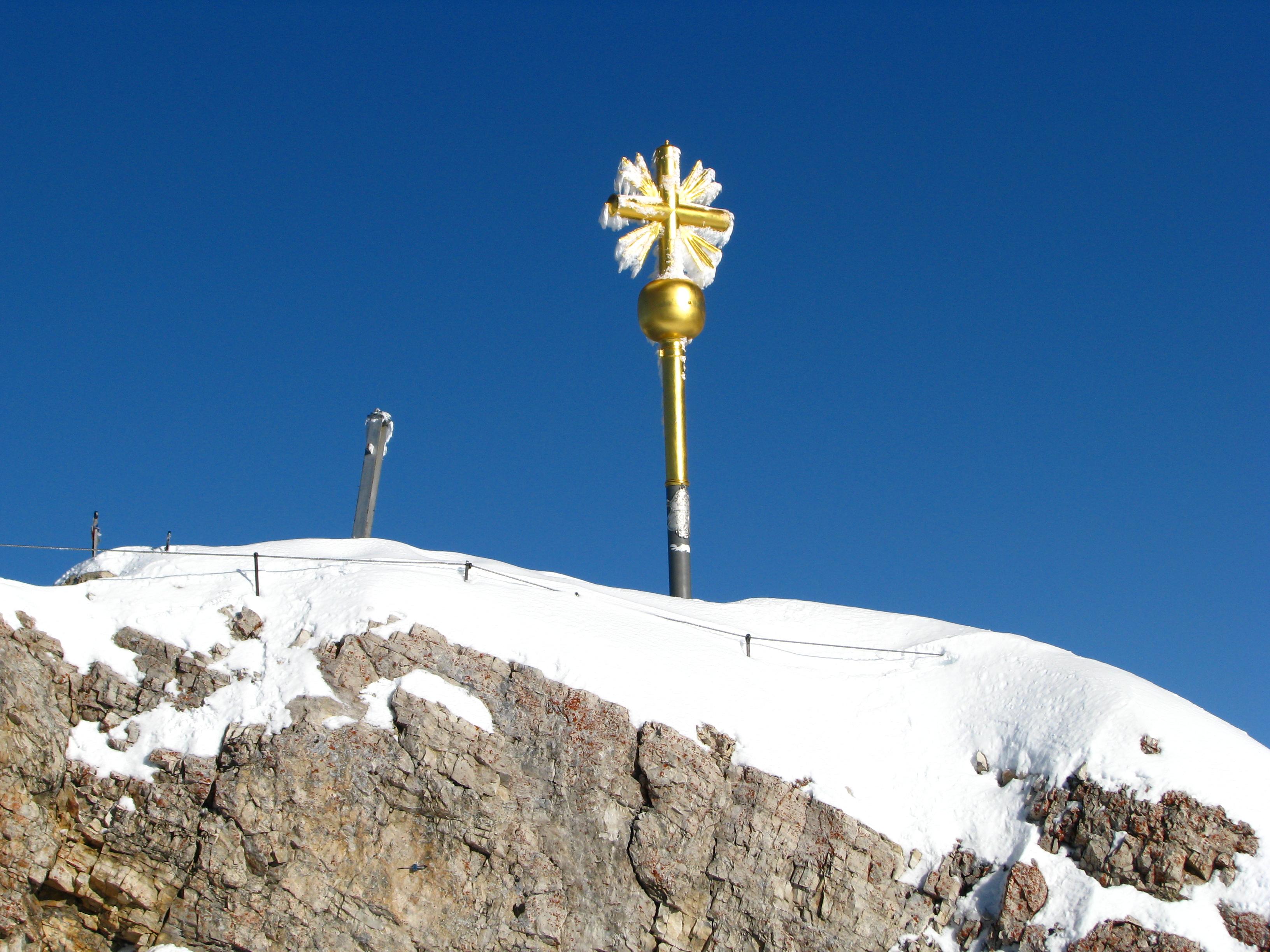 37년 후, 십자가는 수많은 벼락에 맞아 손상되었고 지지대도 심하게 훼손되어 철거되었다. 따라서 1881-1882년 겨울에 십자가는 계곡으로 내려져 수리되었다. 1882년 8월 25일, 7명의 산악 가이드와 15명의 운반자가 십자가를 다시 정상으로 옮겼다. 서쪽 정상에 숙박 시설이 건설되었기 때문에, 팀은 십자가를 동쪽 정상에 설치했다. 십자가는 약 111년 동안 그곳에 있었지만, 1993년 8월 18일에 다시 철거되었다. 이번에는 날씨뿐만 아니라 제2차 세계 대전 종전 시기인 1945년에 미군이 십자가를 사격 표적으로 사용하면서 손상이 발생했다. 정상 십자가를 더 이상 수리할 수 없게 되자, 원래 십자가와 똑같은 복제품이 제작되었다. 두 달 후, 랙 철도는 새 십자가를 10월 12일에 ''추크슈피츠플라트''로 운반했고, 그곳에서 헬리콥터로 정상까지 옮겨졌다. 새 십자가의 높이는 4.88m이다.[43] 2009년에 1.5만유로를 들여 개조 및 재도금되었으며, 2009년 4월 22일부터 다시 동쪽 정상에 세워져 있다.[44]