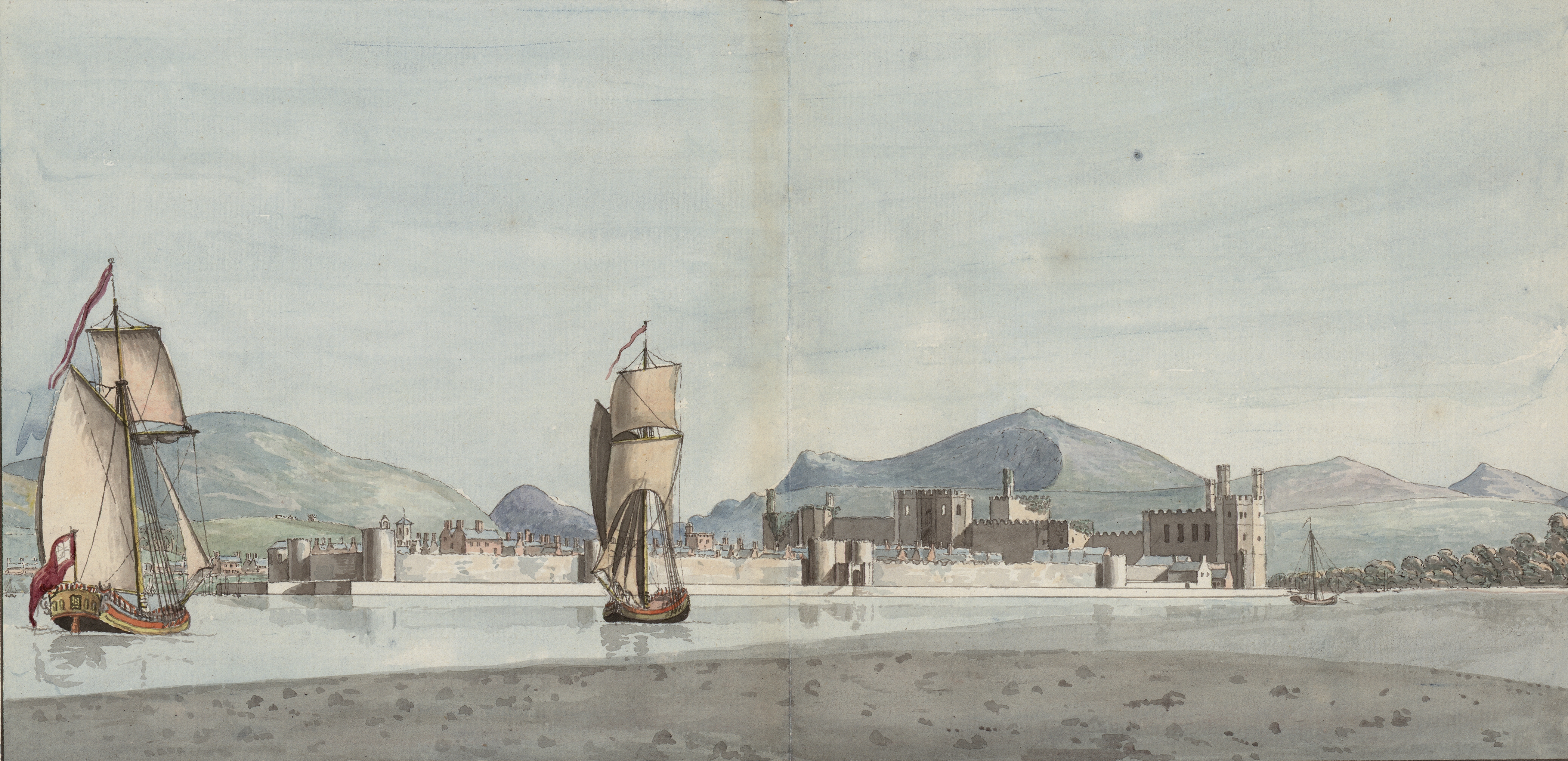 웨일스어로는 ''y gaer yn Arfon'' (몽 섬과 마주보는 땅에 있는 요새)라고 불렀다. 몽 섬(Môn)은 웨일스어로 앵글시 섬을 의미한다.[85]