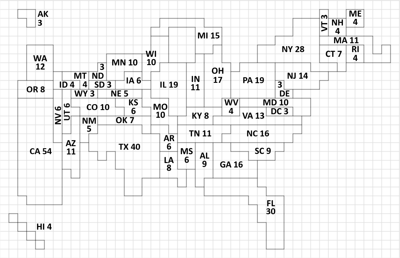 모자이크 카토그램(블록 또는 정규 카토그램이라고도 함)은 각 도형을 단순히 축척하거나 변형하는 대신, 일반적으로 사각형이나 육각형으로 공간을 이산적으로 테셀레이션하여 재구성하는 방식이다. 테셀레이션의 각 셀은 변수의 상수 값(예: 주민 5000명)을 나타내므로, 채워야 할 전체 셀의 수를 계산할 수 있다(반올림 오류로 인해 최종 면적이 변수에 정확히 비례하지 않는 경우가 많다). 그런 다음 해당 셀들을 조합하여 모양을 만들며, 인식에 도움이 되는 주요 특징(예: 롱아일랜드와 케이프 코드는 종종 과장됨)을 포함하여 원래 모양을 유지하려고 노력한다. 따라서 이러한 카토그램은 일반적으로 동형이며 적어도 부분적으로 인접성을 유지한다.이 방법은 셀과 일대일로 일치시킬 수 있는, 비교적 낮은 값의 정수로 측정되는 변수에 가장 적합하다. 이 때문에 미국 대통령 선거를 결정하는 미국 선거인단을 시각화하는 데 매우 인기가 높으며, 텔레비전 방송 및 수많은 투표 추적 웹사이트에 등장한다.[27] 2016년 미국 대통령 선거 기간 동안 ''워싱턴 포스트'',[28] ''FiveThirtyEight'' 블로그,[29] 및 ''월스트리트 저널''[30] 등에서 여러 블록 카토그램의 예시를 발표했다.