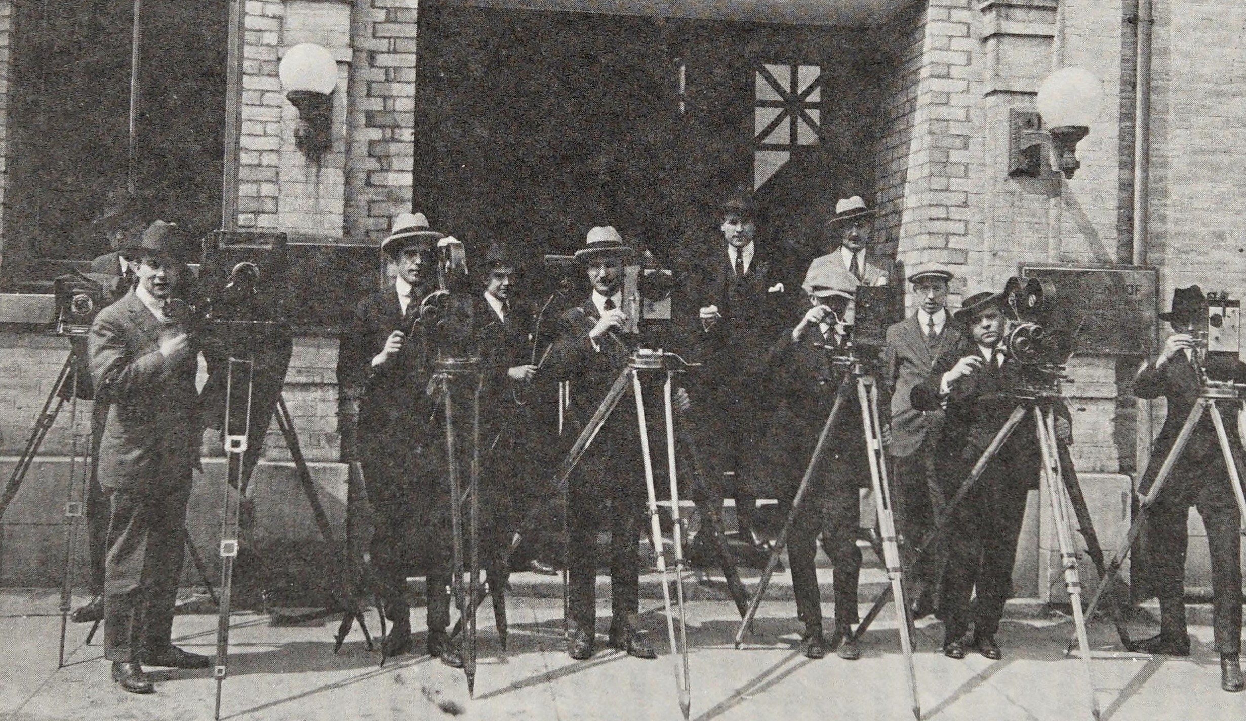 1925년 캐나다 정부 영화국에서 일했던 영화 촬영 기사들. 1927년부터 1941년까지 국장을 역임한 프랭크 배드글리가 배경에 있다.