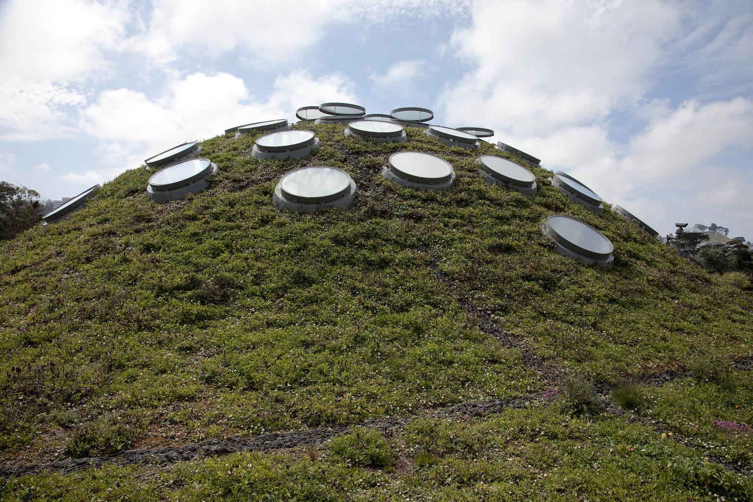 건물 옥상에는 '살아있는 지붕(Living Roof)'이라 불리는 10,000m² 규모의 녹색 지붕이 있다. 여기에는 170만 그루의 캘리포니아 자생 식물이 심어져 있다. 샌프란시스코의 7개 주요 언덕에서 영감을 받아 설계된 이 지붕은 박물관 중앙 광장 위에 거대한 유리 천장으로 덮여 있으며, 밤에는 천장을 열어 시원한 공기를 건물 내부로 유입시키는 자연 환기 방식으로 냉방 시스템 사용을 줄여 에너지 효율을 높였다. 이러한 설계로 렌조 피아노와 SWA 그룹은 2009년 미국 조경 건축가 협회(American Society of Landscape Architects, ASLA) 디자인 상을 수상했다.