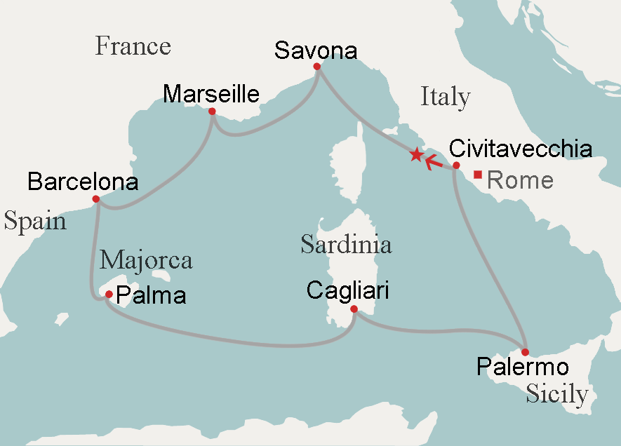 사고 당시, 해당 선박은 치비타베키아를 출발하는 7일간의 서지중해 크루즈 중이었으며, 항해가 순조로웠다면 이탈리아의 사보나, 프랑스의 마르세유, 스페인의 바르셀로나, 팔마 데 마요르카, 이탈리아의 칼리아리, 팔레르모에 기항할 예정이었다.[94][95]