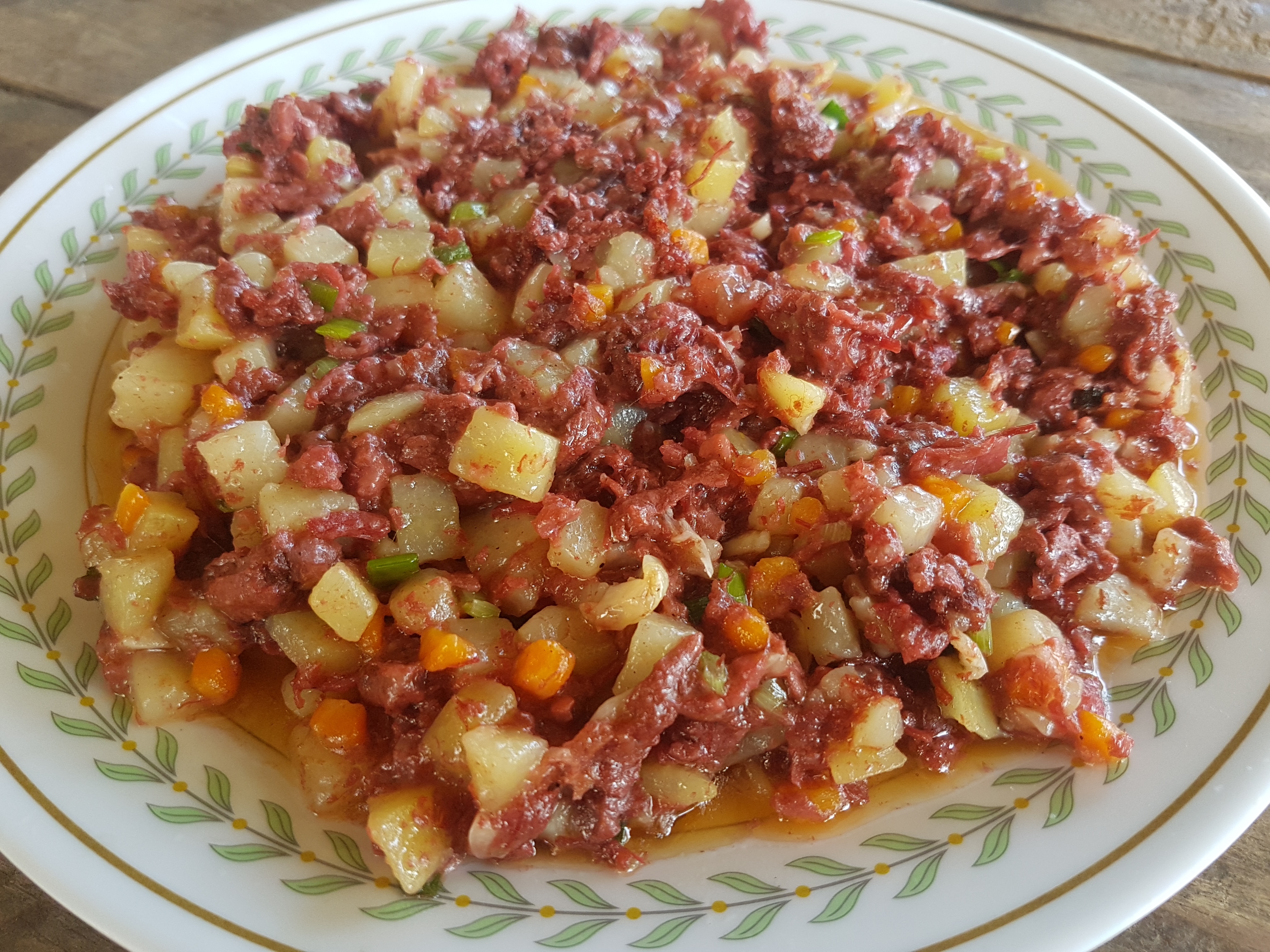 감자와 함께 으깬 콘드 비프는 계란과 함께 미국에서 흔히 먹는 아침 식사 요리이다.
