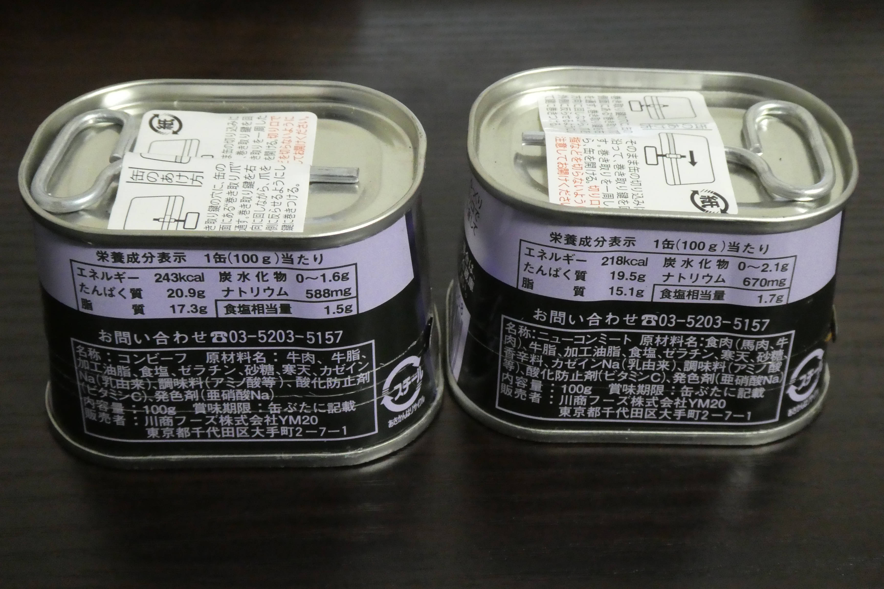 베개 캔의 인기는 압도적으로 높다고 하며[59], 바리에이션이 존재한다[60]。표준적인 둥근 모양의 통조림은 "노자키의 콘드 비프 860g"[61], "노자키의 뉴 콘 미트 860g"[62]와 자위대의 부식용 통조림의 일종으로 방위성사양서[63](DSP-Defense Specifications) 번호 N 5106[65]으로 정의되는 콘드 미트 통조림 등, 소수파가 되었다.