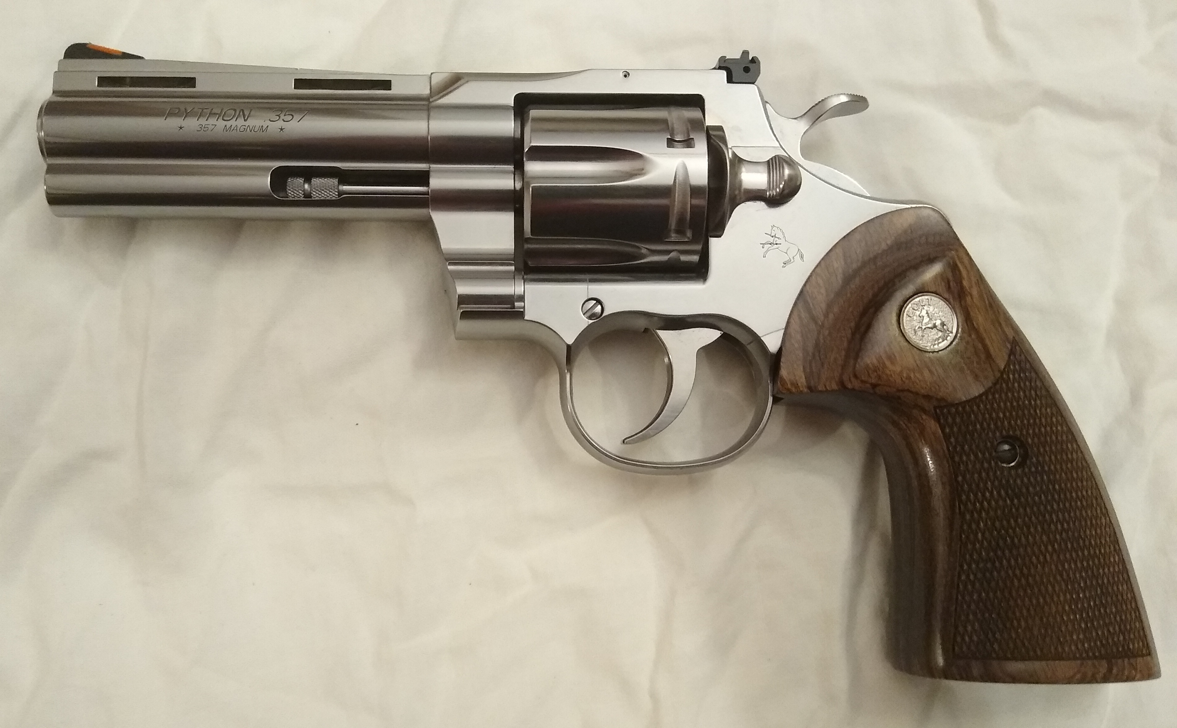 콜트 파이선은 1955년 콜트사에서 출시된 최고급 리볼버로, .357 매그넘탄과 .38 스페셜탄을 사용할 수 있다. 6인치, 4인치, 2.5인치 총열 모델이 있으며, 8인치 "파이선 헌터"와 3인치 "컴뱃 파이선"도 존재한다. 수작업으로 제작되어 "리볼버의 롤스로이스"로 불렸으나, 생산 중단과 재판매를 거쳐 현재 2세대 모델이 판매되고 있다. 법 집행 기관과 표적 사격 선수들에게 인기가 있었으며, 다양한 대중 매체에 등장하기도 했다. 하지만, 무게와 타이밍 문제, 스태킹 현상 등의 단점도 존재한다.