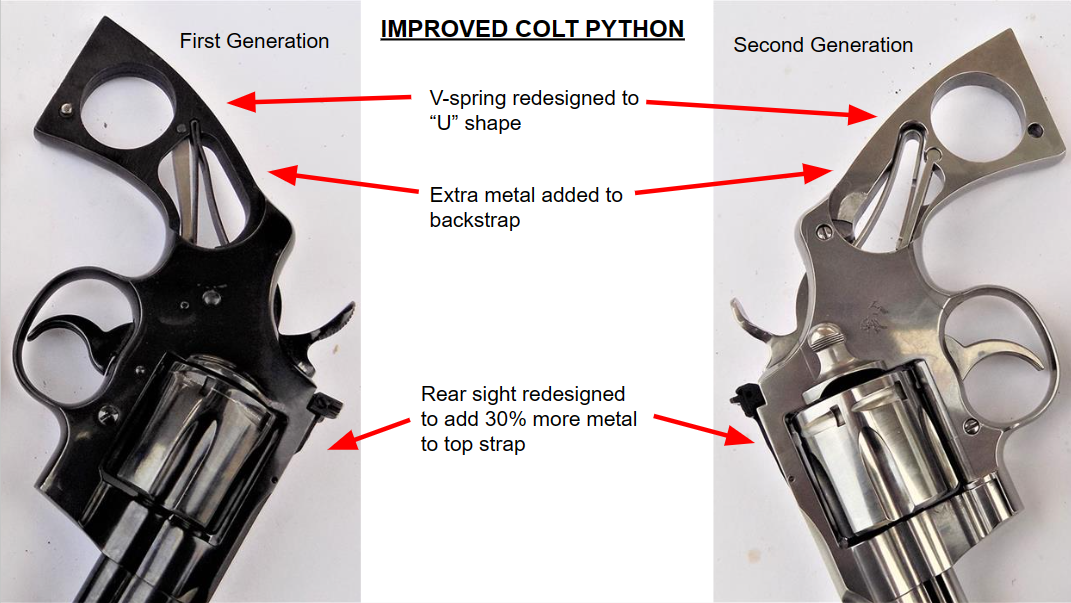 2020년 1월, 콜트사는 2세대 콜트 파이선을 공식적으로 출시했다. 새로운 파이선은 이전 세대보다 더 강한 스테인리스강으로 제작되어 내구성이 강화되었다. 또한, 후방 조절식 조준기 아래에 30% 더 많은 강철을 추가하여 총의 강도를 더욱 높였다.[19] 이는 1950년대와 60년대에 사격대회용으로 설계되었던 초기 파이선이 .357 매그넘탄과 같이 더 강력한 탄을 사용할 때 내구성이 약하다는 평판을 개선하기 위한 조치였다. 2세대 파이선의 강철은 더 강력한 현대 야금술을 활용하여 제작되었으며, 1983년부터 사용된 410 계열 스테인리스강 대신 더 강하고 부식에 강한 합금이 사용되었다.[19]
