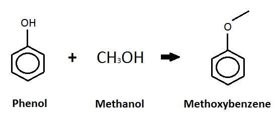 이 그림은 페놀과 메탄올 간의 o-알킬화를 보여준다. c-알킬화와 달리 o-알킬화는 -OH 기의 수소 원자를 메틸기(메탄올에서 유래)로 대체한다. o-알킬화의 생성물은 아니솔로 더 잘 알려진 메톡시벤젠과 물이며, 그림에는 표시되지 않았다. 아니솔은 장기적인 영향으로 인해 수생 생물에 급성 위험으로 등재되어 있다.[11]