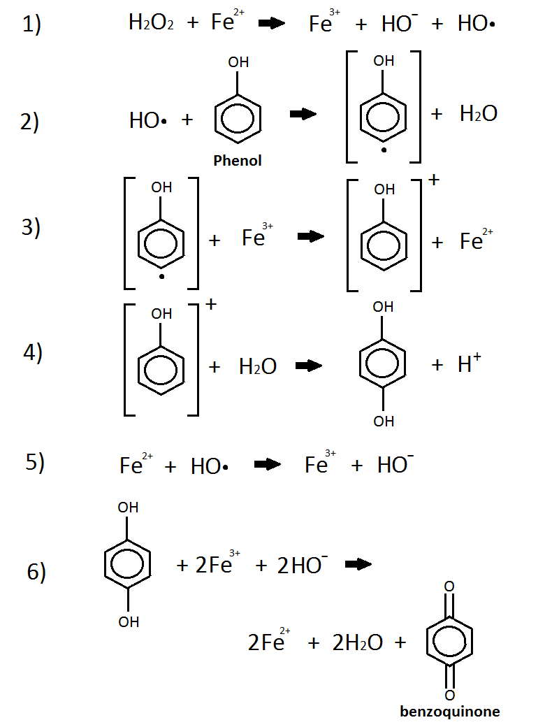 이 반응은 철과 과산화물에 의한 페놀의 산화를 보여준다. 퇴적물 속 산화철에서 유래하는 철과 동물과 식물이 환경으로 배출하는 과산화물의 조합은 펜톤 시약으로 알려져 있다. 이 시약은 p-벤조퀴논 내 과산화물에서 생성된 라디칼 수산화기를 사용하여 페놀기를 산화시키는 데 사용된다. 페놀 산화의 이러한 생성물은 이제 환경으로 침출되며, 다른 생성물에는 철(II)와 물이 포함된다. p-벤조퀴논은 매우 유독한 급성 환경 유해 물질로 등재되어 있다.[13]