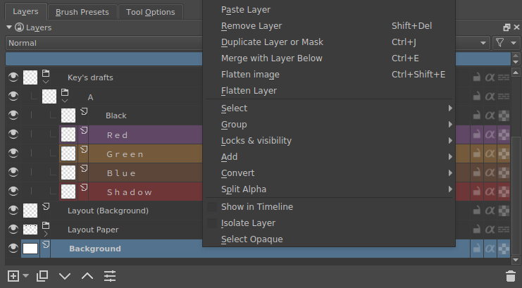 포토샵 계열 소프트웨어의 "레이어 그룹"에 해당하는 "그룹 레이어" 기능을 가지고 있다. "그룹 레이어"는 중첩 구조를 가질 수 있으며, 특정 그룹 레이어에 필터 레이어로 필터 효과를 적용할 수 있다.