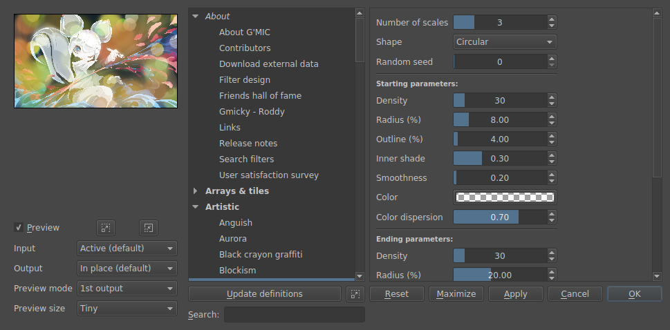 G'MIC를 내장하여 원클릭으로 다양한 효과를 적용할 수 있다.