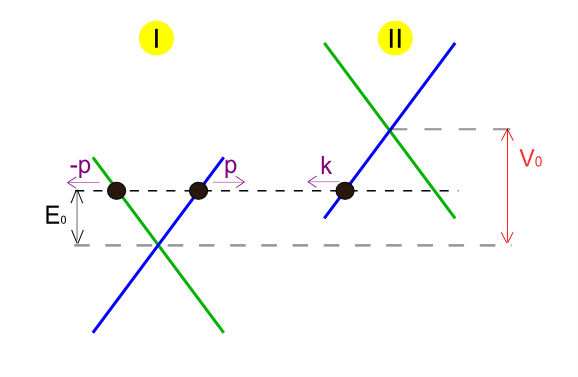 질량이 없고 에너지 이고 운동량 를 가진 상대론적 입자가 높이 의 포텐셜 계단에 접근한다고 가정한다. 입자의 파동 함수 는 시간 독립 디락 방정식을 따른다.