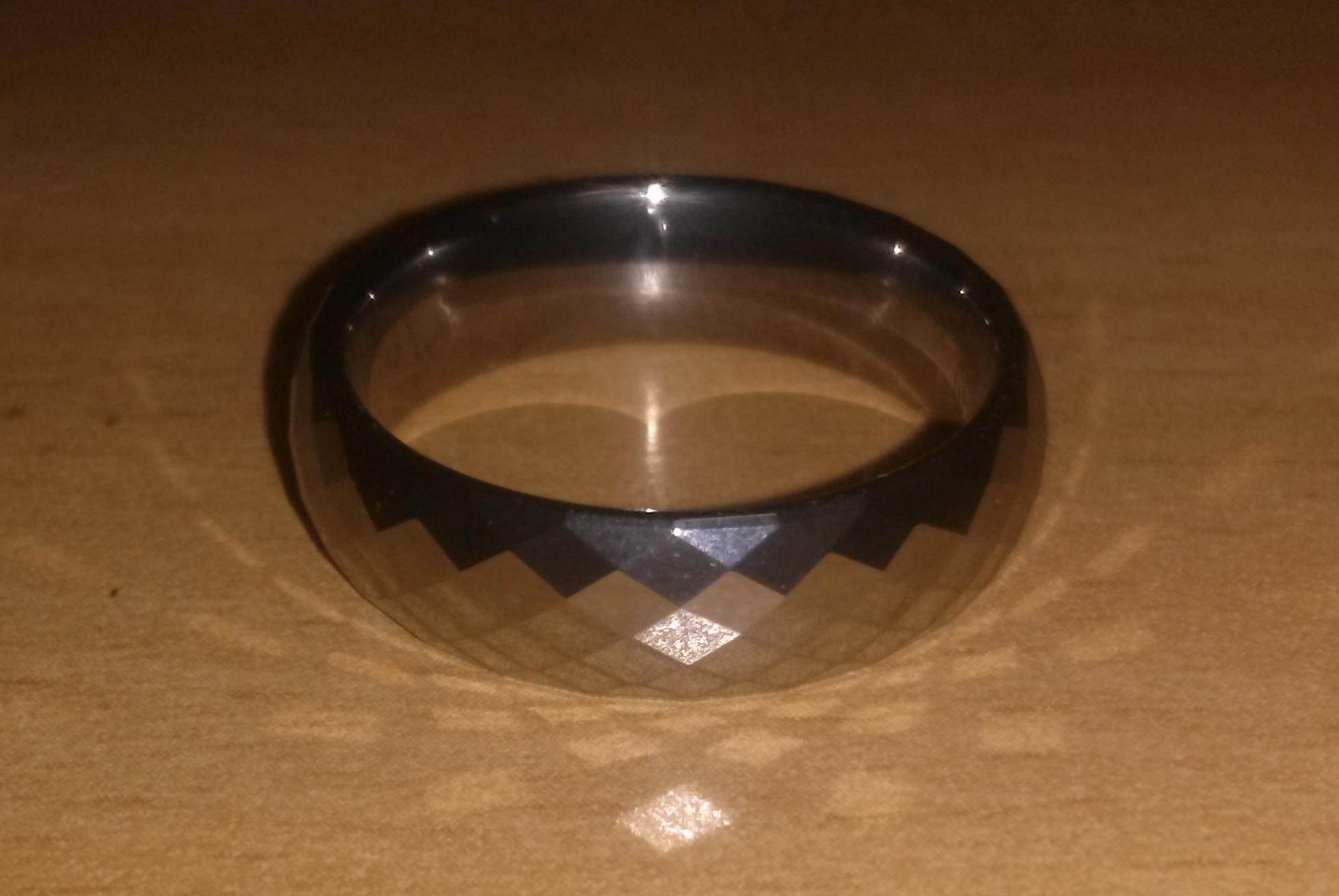 - 장신구: 주로 시멘트화 탄화물(탄화물 입자를 금속 결합재로 굳힌 것) 형태로 반지와 같은 장신구 제작에 사용된다. 극도로 단단하고 긁힘에 강해 인기가 높다.[51][49] 하지만 매우 단단한 만큼 강한 충격에는 깨질 수 있다.[50] 사고 시 절단이 어려운 귀금속 반지와 달리, 충격을 받으면 산산조각 나 제거가 용이하다는 장점이 있지만, 응급 상황에서는 특수 공구가 필요할 수도 있다.[52]