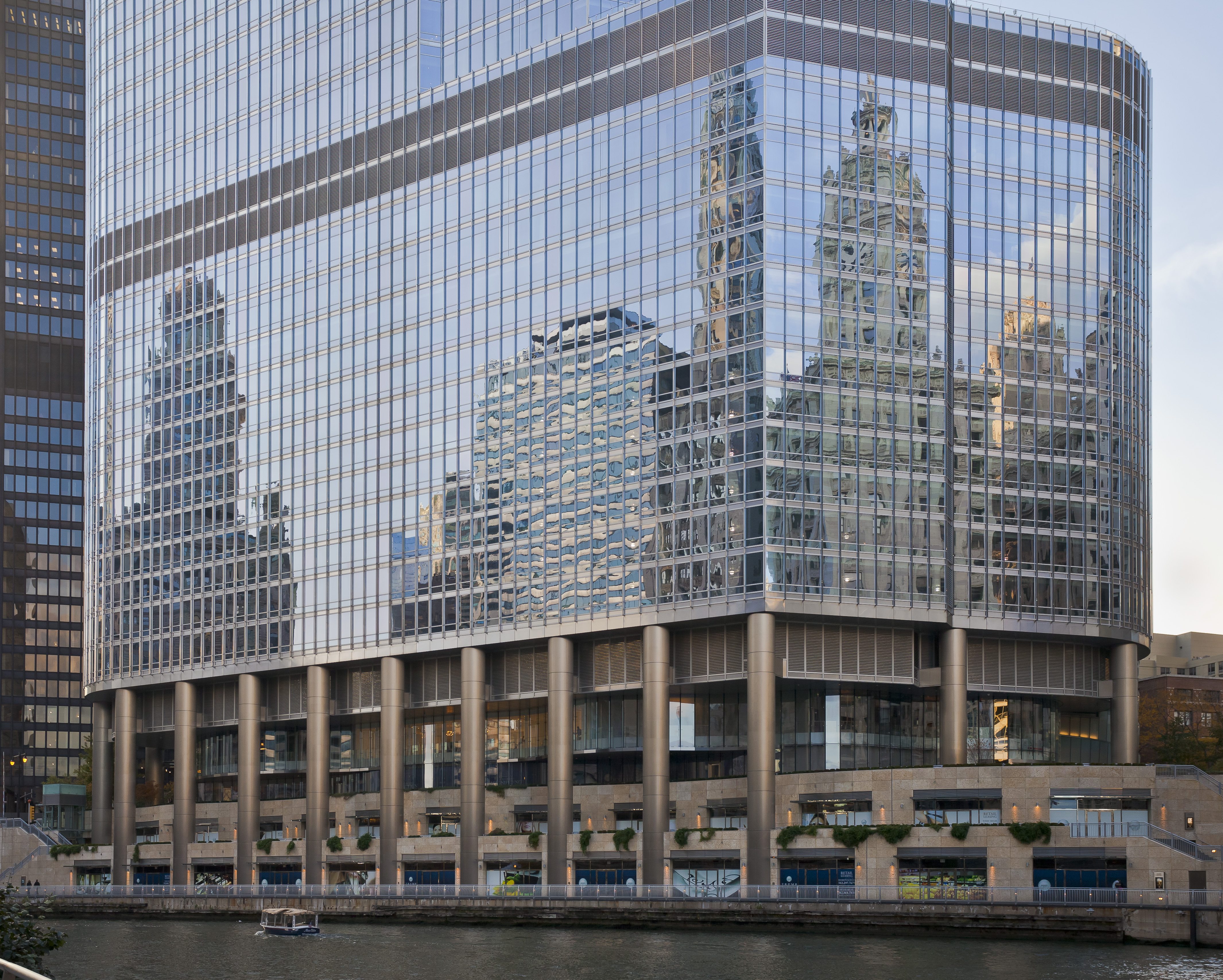 건물의 디자인은 주변의 스카이라인과 시각적인 연속성을 제공하도록 설계된 세 개의 셋백 기능을 통합하고 있으며,[4] 각각 인근 건물의 높이를 반영한다. 건물 동쪽에 있는 첫 번째 셋백은 동쪽에 있는 리글리 빌딩의 처마 돌림띠 선과 일치하고, 두 번째 셋백은 북쪽에 있는 리버 플라자와 서쪽에 있는 마리나 시티 타워와 일치한다. 세 번째 셋백은 동쪽에 있는 330 노스 와바시 빌딩 (구 IBM 플라자)과 관련이 있다.[5] 그러나 일부 뷰에서는 두 번째 셋백의 정렬이 왜곡된다. 셋백과 건물의 둥근 모서리는 소용돌이 형성을 방지한다.[127]3. 2. 외관