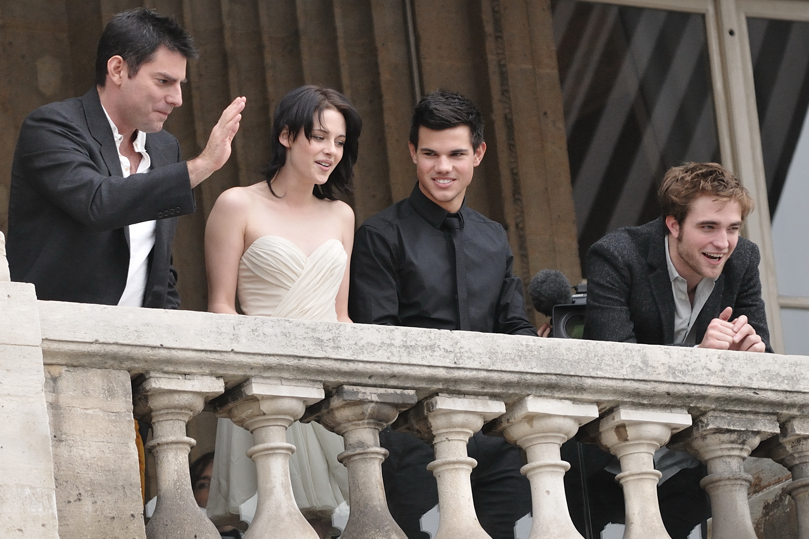 (왼쪽부터) 크리스 웨이츠 감독, 크리스틴 스튜어트, 테일러 로트너, 로버트 패틴슨이 2009년 11월 10일 프랑스 파리에서 열린 ''뉴 문'' 포토콜에 참석하고 있다.