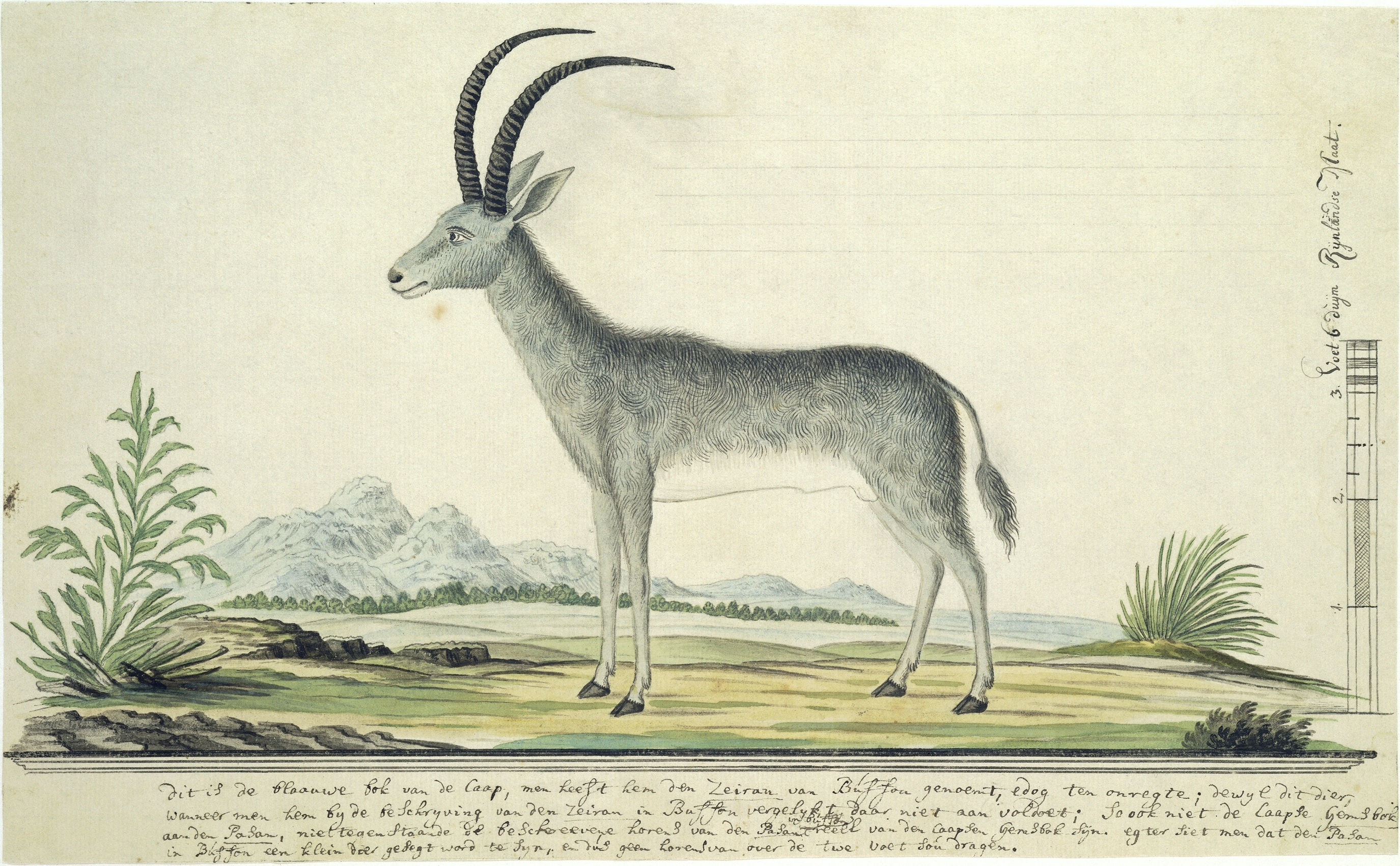 1771년 웨일스 자연학자 토머스 페넌트는 "파란 염소"라고 부르는 영양에 대한 설명을 포함시켰다. 1778년, 장-니콜라-세바스티앙 알라망의 그림이 뷔퐁 백작의 ''박물지''에 포함되었으며, 그는 그 영양을 고비가젤(''Gazella subgutturosa'')의 시베리아 이름인 ''tzeiran''이라고 불렀다. 이 삽화는 라이덴의 표본을 기반으로 한 것으로 널리 알려져 있다.[2][16] 1780년대에 출판된 프랑스 탐험가 프랑수아 르바일랑의 여행기에서도 파란영양에 대한 기록을 찾아볼 수 있다. 독일 동물학자 마르틴 리히텐슈타인은 1812년에 파란영양에 대해 썼지만, 이후 문헌에서는 이 종에 대한 언급이 줄어들었다.