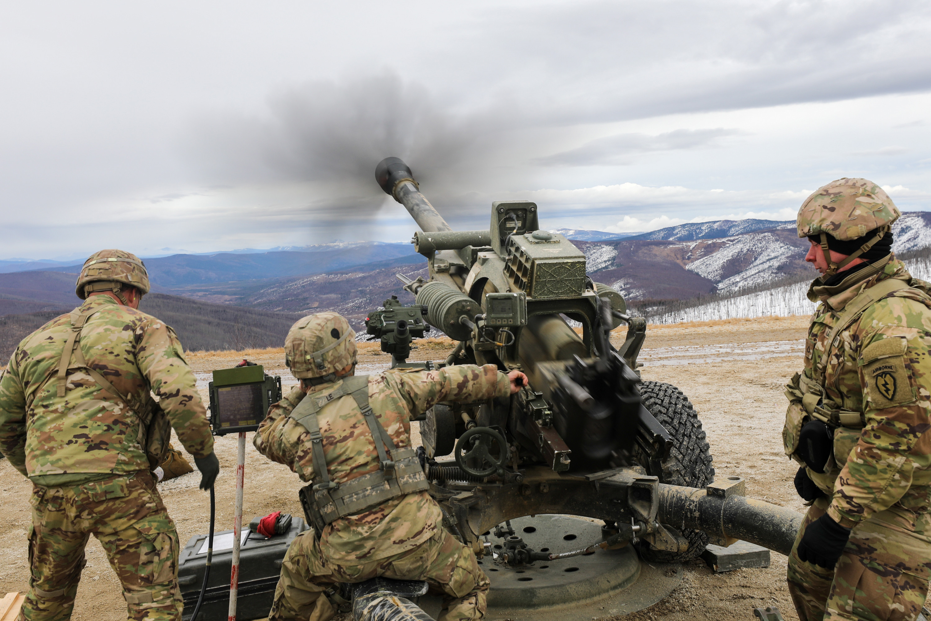 2021년 유콘 훈련장에서 M119 곡사포 훈련을 하는 군인들.