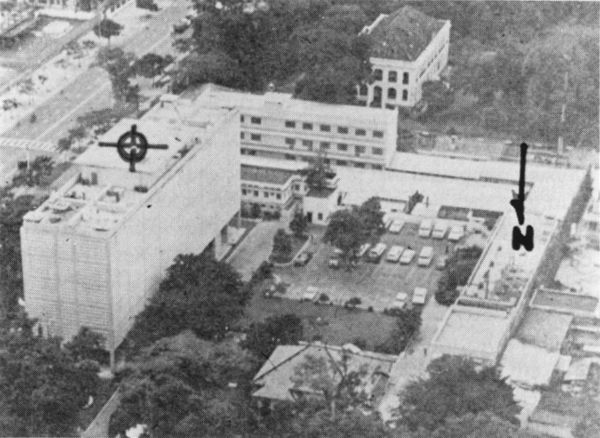 주사이공 미국 대사관의 항공 사진. 맨 왼쪽은 통녓 대로, 왼쪽은 법원 청사, 중앙은 주차장, 위쪽은 미국 영사관 구내, 사이공 주재 프랑스 대사관이다.