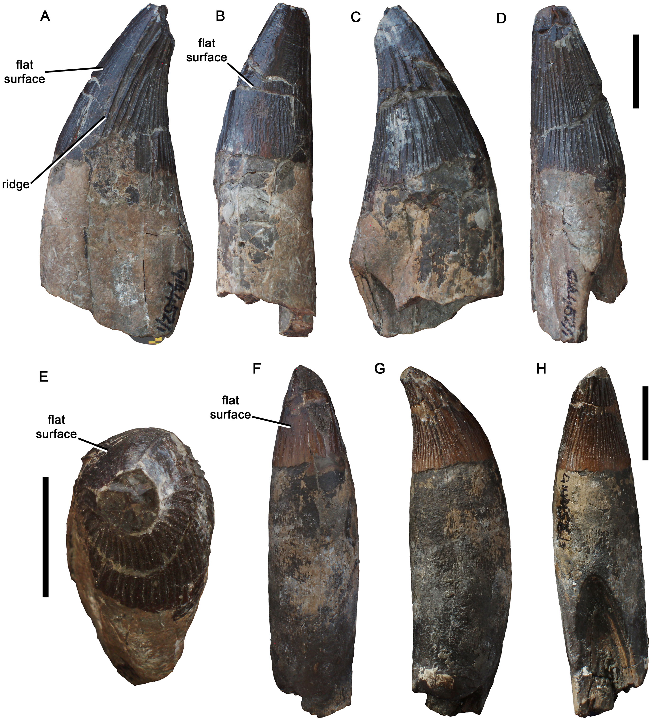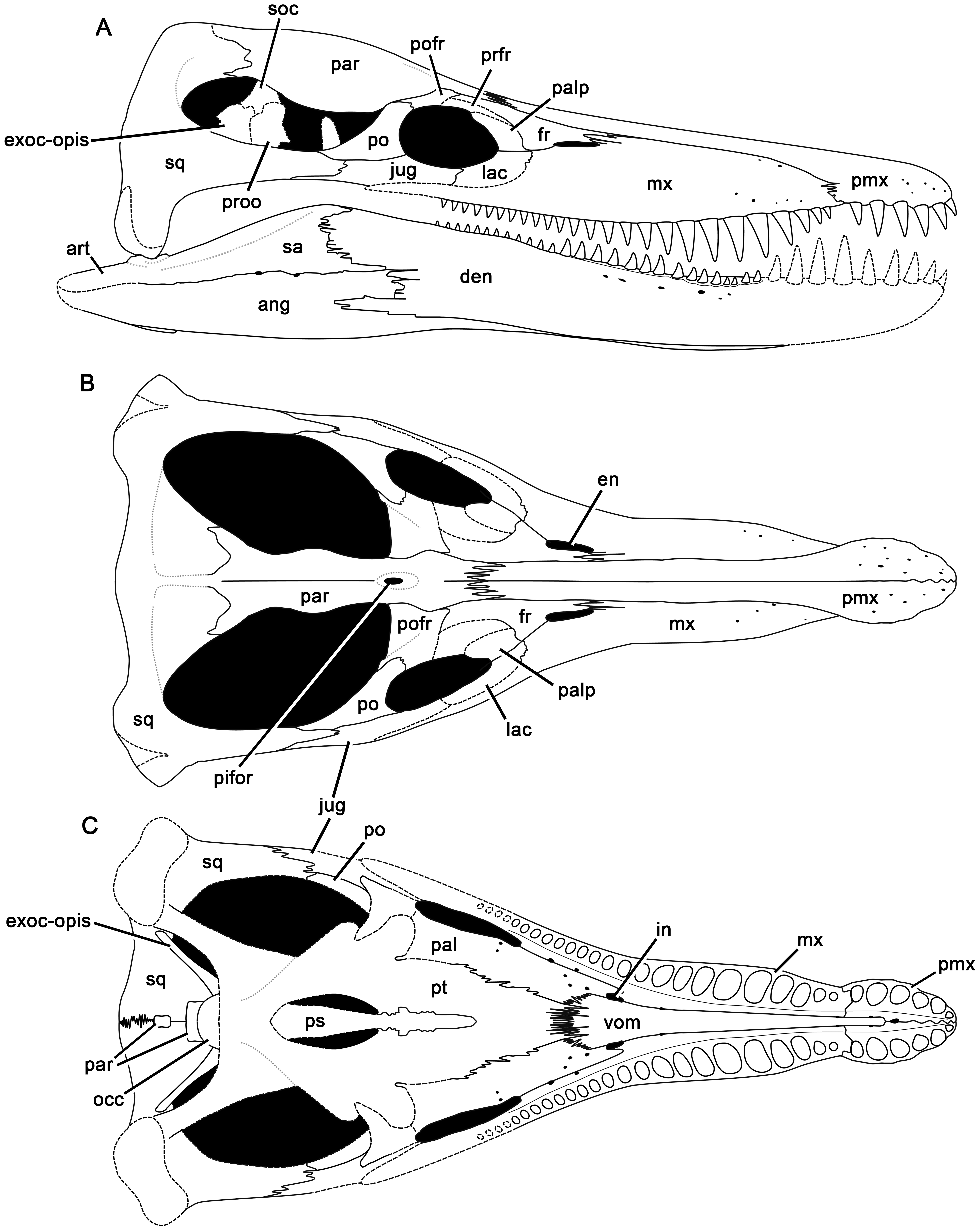 - 전상악골과 상악골의 견치형 부위가 옆으로 확장됨 (압착에 의한 변형일 수 있음)