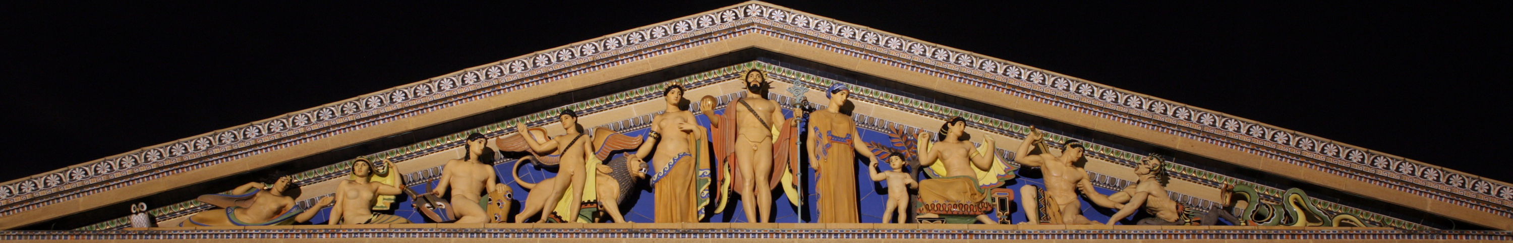 건물의 8개 박공은 조각 그룹으로 장식될 예정이었다. 완성된 유일한 박공인 C. 폴 제네바인이 제작하고 레옹 V. 솔롱이 채색한 "서양 문명"(1933)에는 그리스 신과 신화 속 인물을 묘사한 채색 테라코타 조각이 특징으로 나타난다.[21] 이 조각 그룹은 뉴욕 건축 연맹 명예 훈장을 수상했다.[22]