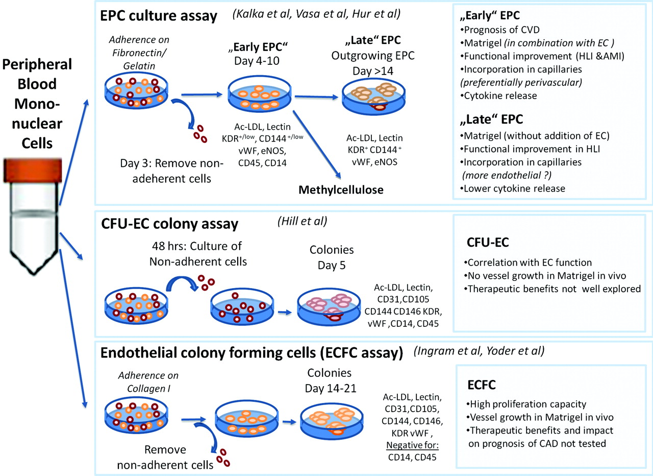 초기에 배양된 추정 EPC 집단에 대한 분자 유전학적 분석 결과, 이 세포들은 실제로는 단핵구와 유사한 유전자 발현 패턴을 보이는 것으로 나타났다. 이는 후기에 배양되는 세포나 혈관내피 콜로니 형성 세포(ECFC)와는 다른, 별개의 전구 세포 집단이 존재함을 시사한다.[8] 또한, 초기에 배양된 세포들은 아세틸화 저밀도 지단백질(Dil-Ac-LDL)과 먹물을 잘 흡수하고 eNOS 발현이 낮은 등 다른 단핵구의 기능적 특징들을 유지하고 있었다. 이들 초기 배양 세포, 즉 CFU-Hill 또는 CAC는 단핵구에서는 발현되지만 내피 세포에서는 발현되지 않는 지질다당류 수용체인 CD14를 발현하는 것으로도 밝혀졌다.[9]