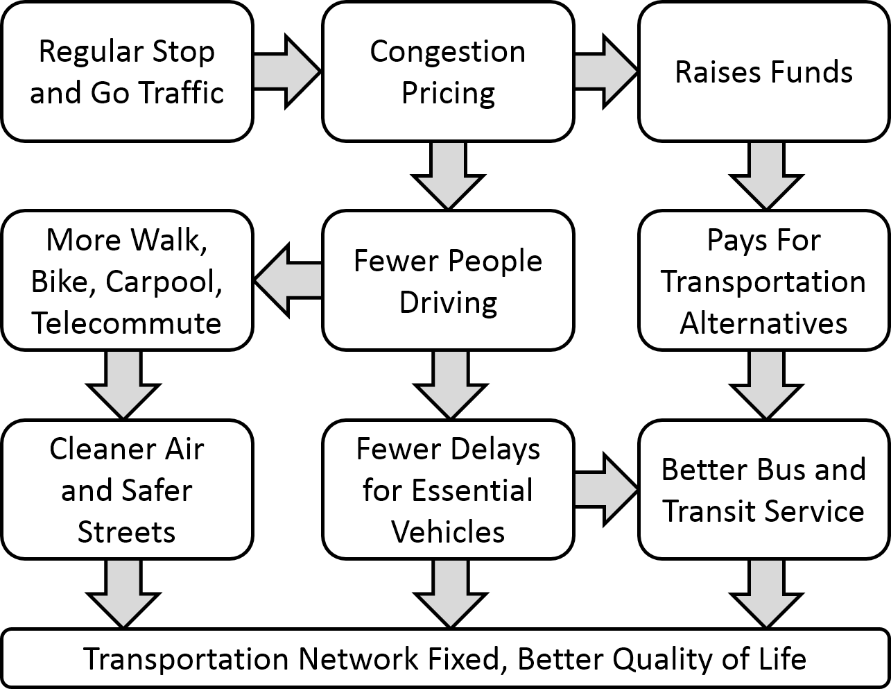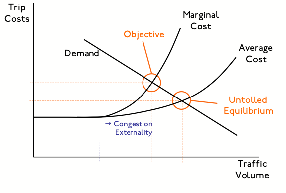 혼잡 통행료는 시장 경제의 개념으로, 가용한 공급을 초과하는 피크 수요로 인해 발생하는 외부 효과에 대해 공공재 이용자에게 가격 메커니즘을 사용하여 요금을 부과하는 것이다. 가격이 0일 때 수요가 공급을 초과하여 부족이 발생하는데, 공급을 늘려 가격을 낮추는 대신 균형 가격을 부과하여 부족을 해결해야 한다는 것이 경제적 근거이다. 일반적으로 특정 시간대 또는 혼잡이 발생하는 장소에서 가격을 인상하거나, 세금으로 지원되는 공공재의 경우 피크 수요가 가용 공급을 초과할 때 새로운 세금 또는 요금을 도입하는 것을 의미한다.[20]